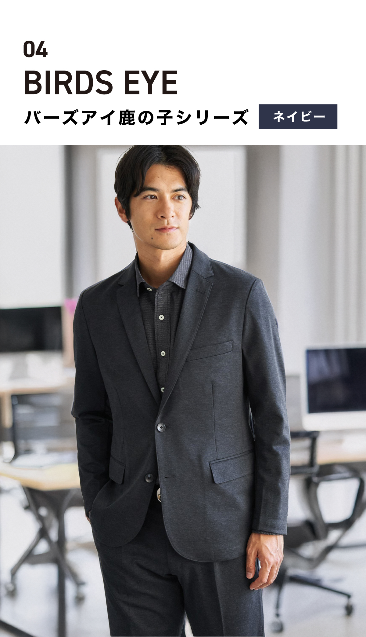 ビジネスの定番であるネイビーのセットアップ。よりフォーマル感の強い印象でありつつも、軽やかかつ伸縮性に秀でたジャージ素材を採用することでストレスフリーな着心地を実現しました。ジャケットインのスイスカラーシャツはこちらもGOKU楽ワークシリーズで、ほどよい厚みと凹凸感があり弾力・伸縮性のあるカットワッフル素材を使用。通気性、吸湿性に優れており肌触りが良いのが特徴です。