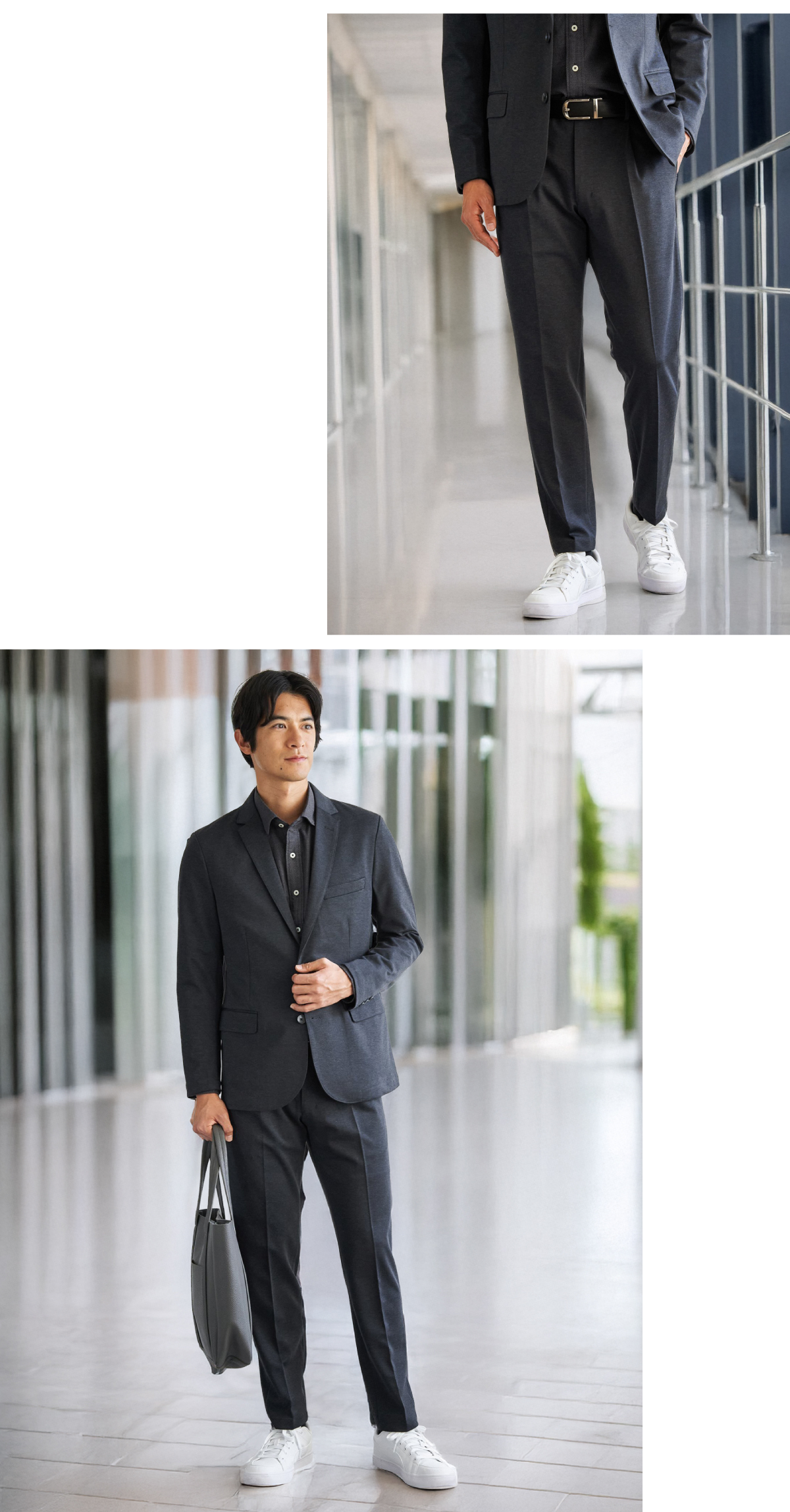同じくライトデニムシリーズより、ネイビーのセットアップも登場。より爽やかな印象で清潔感溢れるシャツが際立ちます。シャツはシワになりにくいソフトオックス素材で好印象をキープし、ジャケットを脱いでも安心です。同素材のボトムもストレッチ性抜群で足捌きがよくアクティブに動ける1着です。