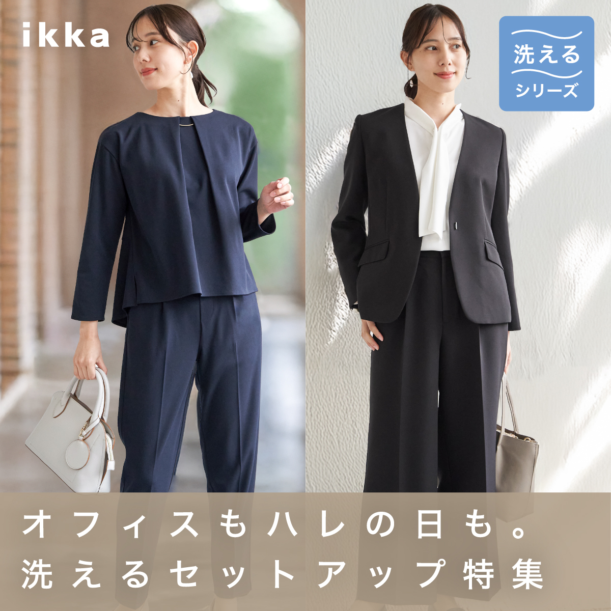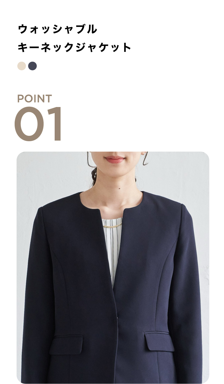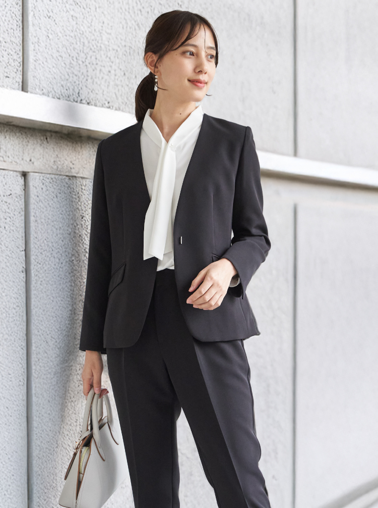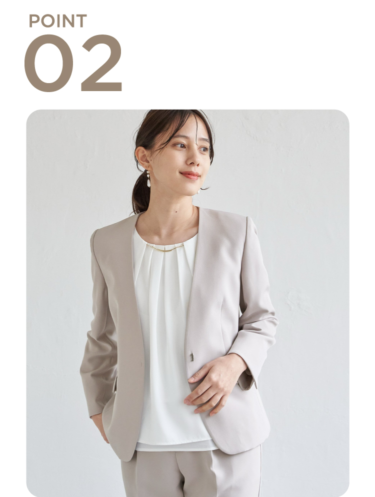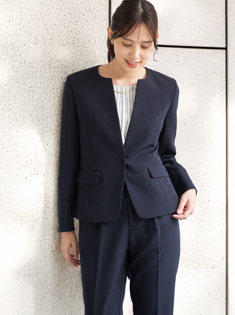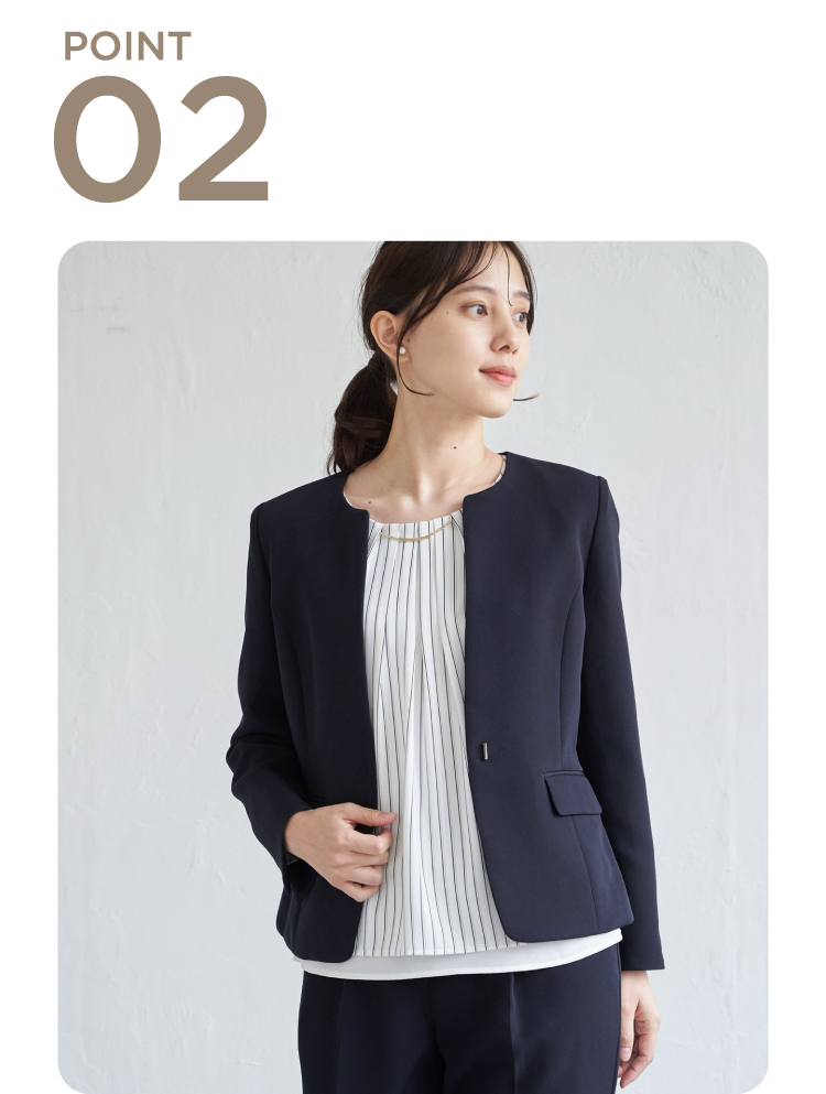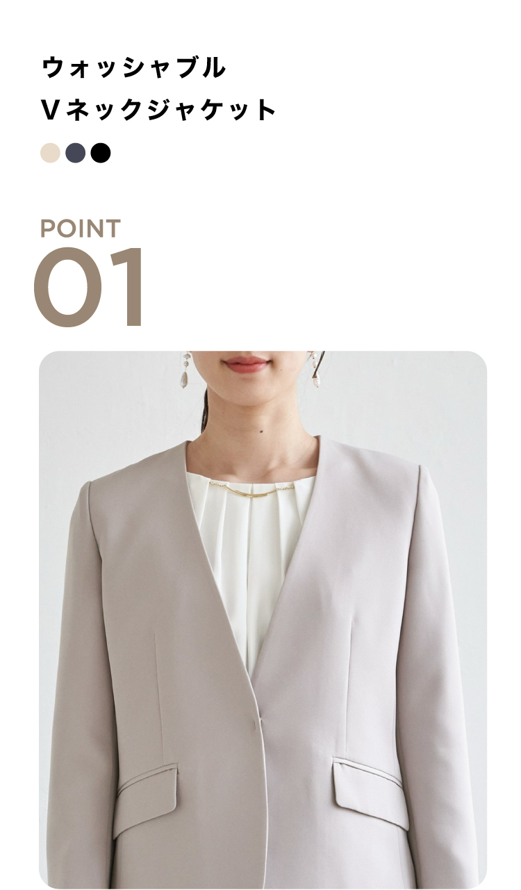 通勤もセレモニーもスマートにこなせるウォッシャブルVネックジャケット。自宅で洗えるウォッシャブル仕様だから、日常使いも特別な日も清潔感をキープできます。また、2WAYストレッチで動きやすく移動の多い日でも余裕!今年はサイズ感を改良し、ウエストが高く見えるようにシルエットを変更しました。