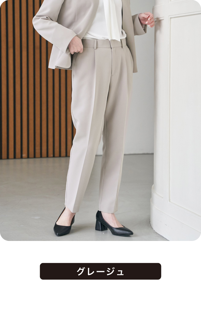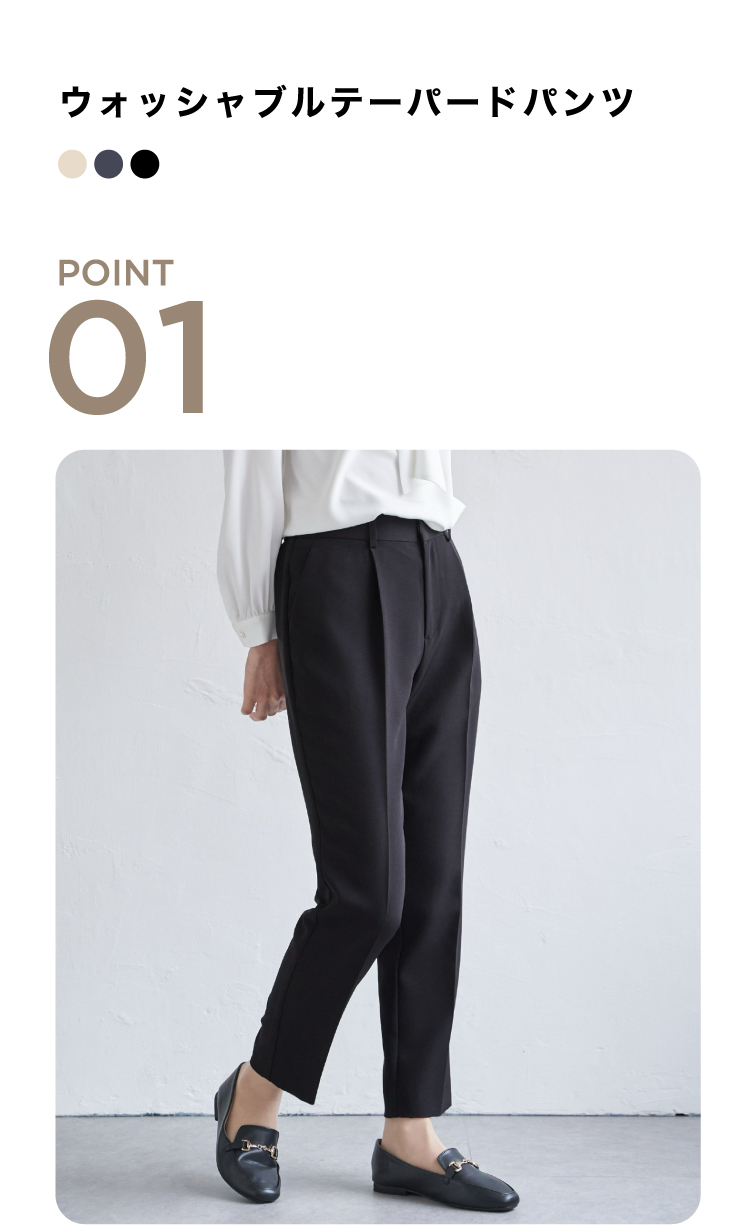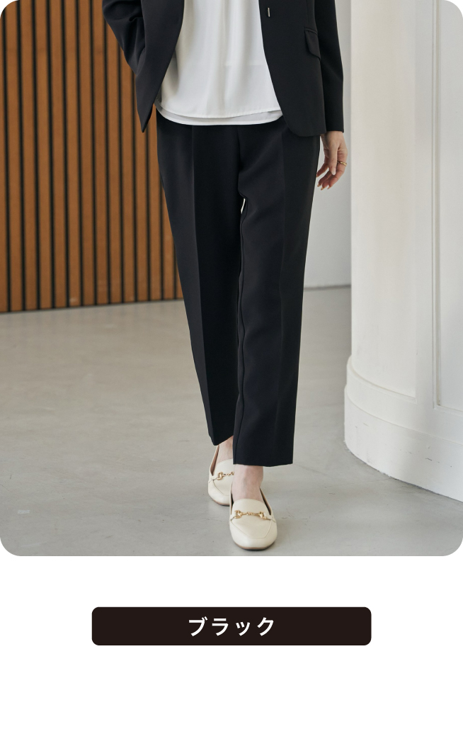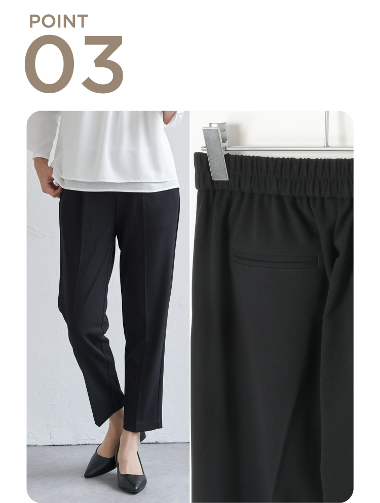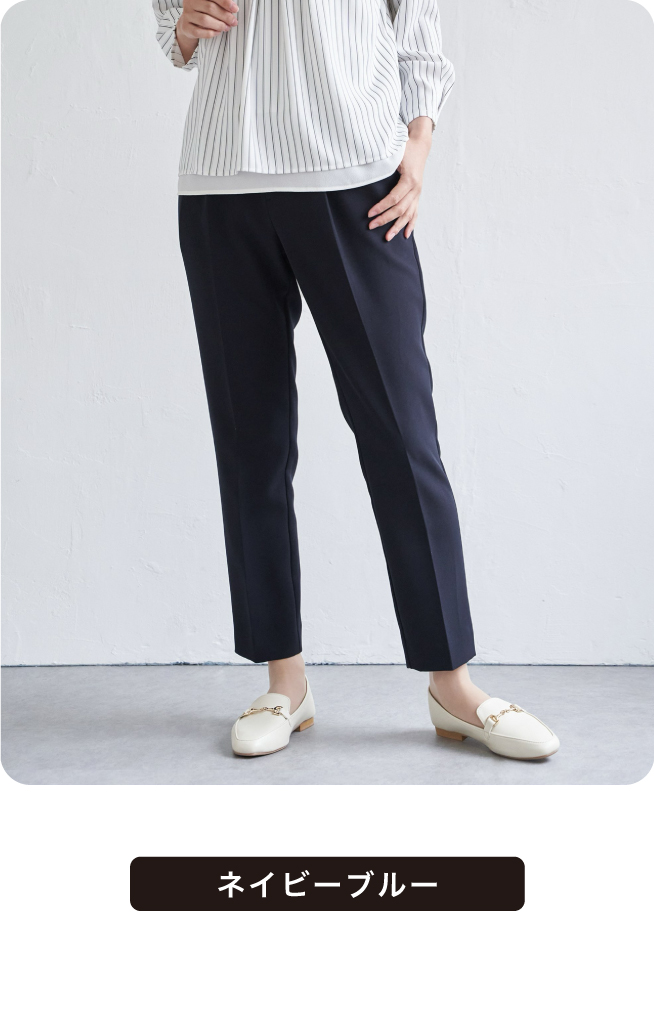 動きやすさと上品さを両立したテーパードパンツ。膝下から足首にかけて美シルエットを追求しました。センタープレス入りで足元スッキリ見せ。様々なトップスとの相性も良く着回し力No,1のアイテムです。