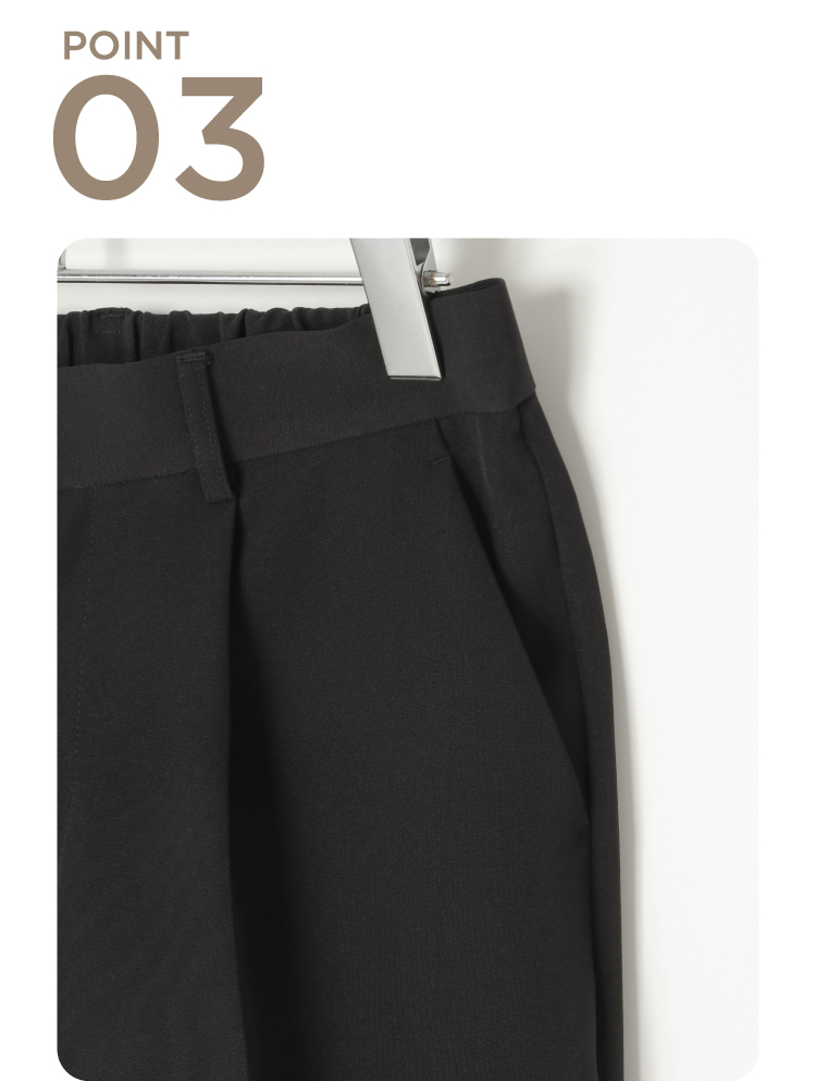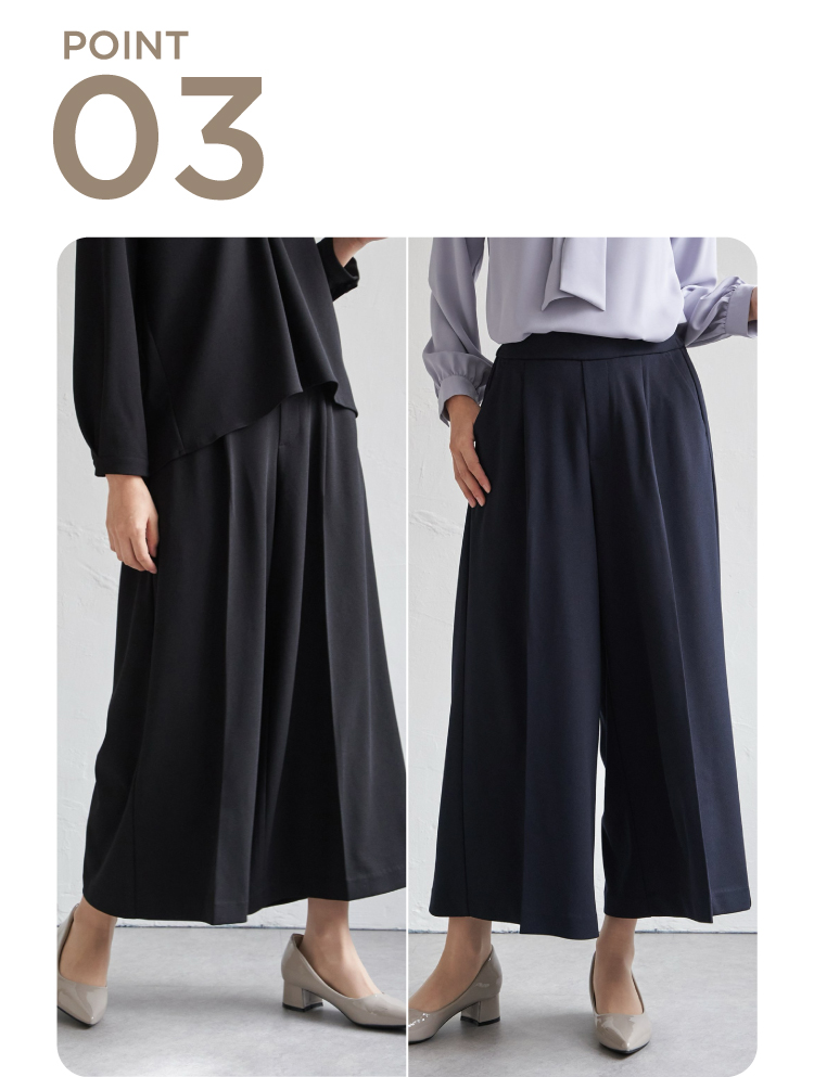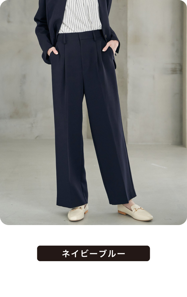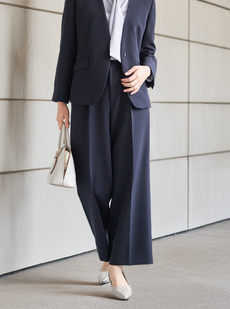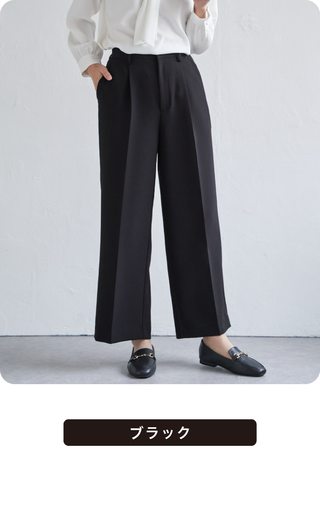 キレイめシルエットで通勤にはもちろん、セレモニーシーンにも対応可能。広がりすぎないストレートめなキレイめワイドパンツで歩く度に美しいドレープが生み出されます。