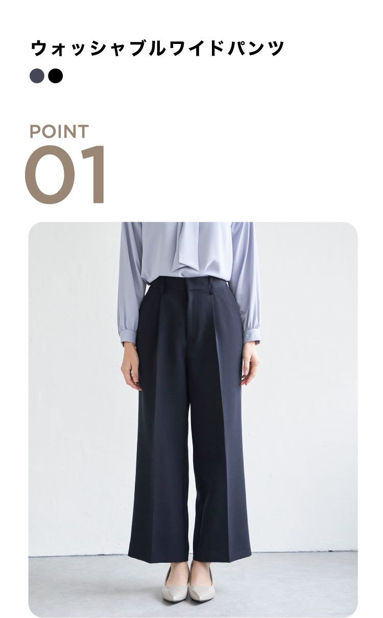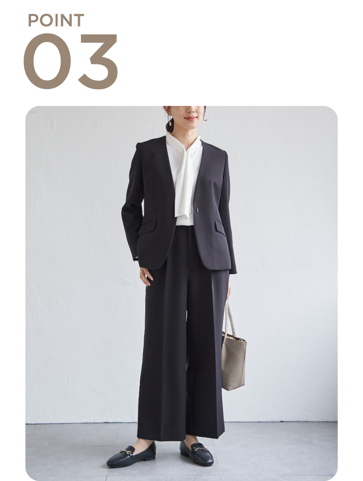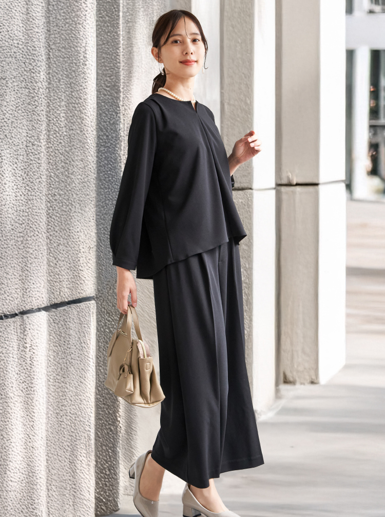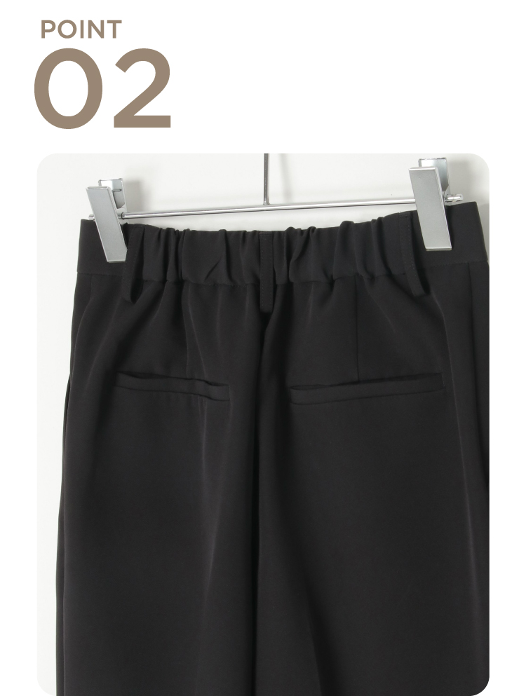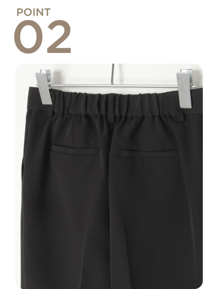 キレイめシルエットで通勤にはもちろん、セレモニーシーンにも対応可能。広がりすぎないストレートめなキレイめワイドパンツで歩く度に美しいドレープが生み出されます。