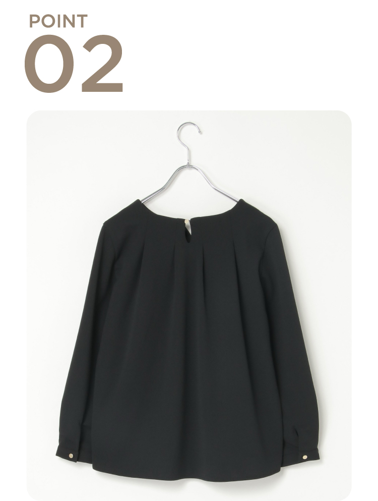 キーネックデザインでフェミニンな印象。袖のボタンも、きらりと上品に輝きます。