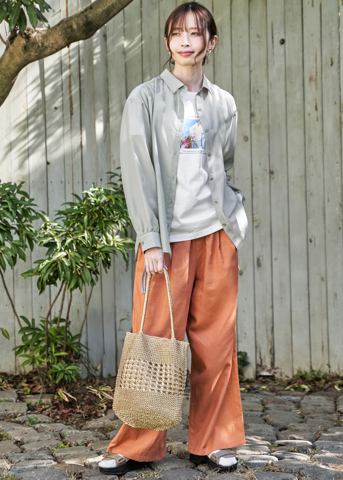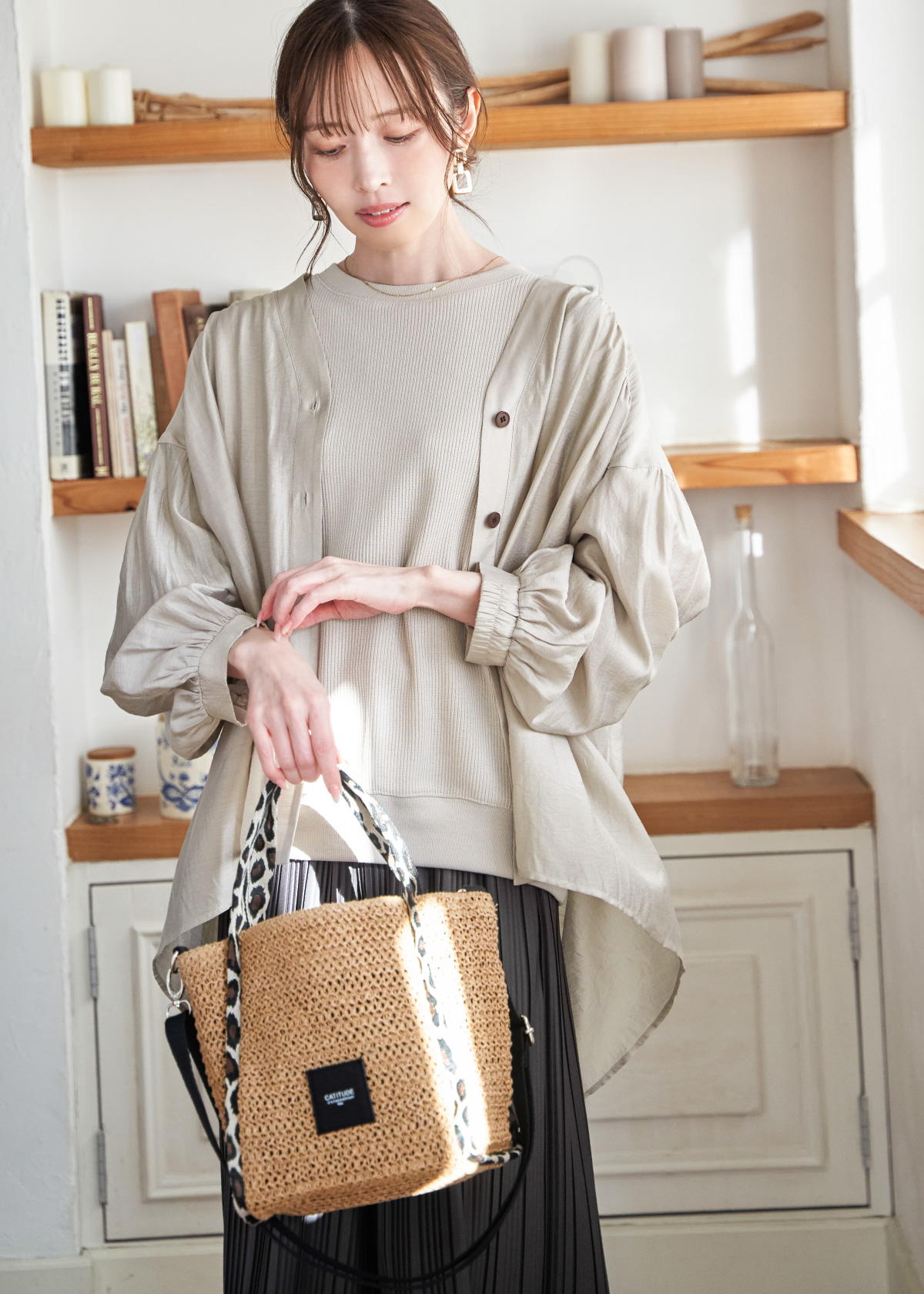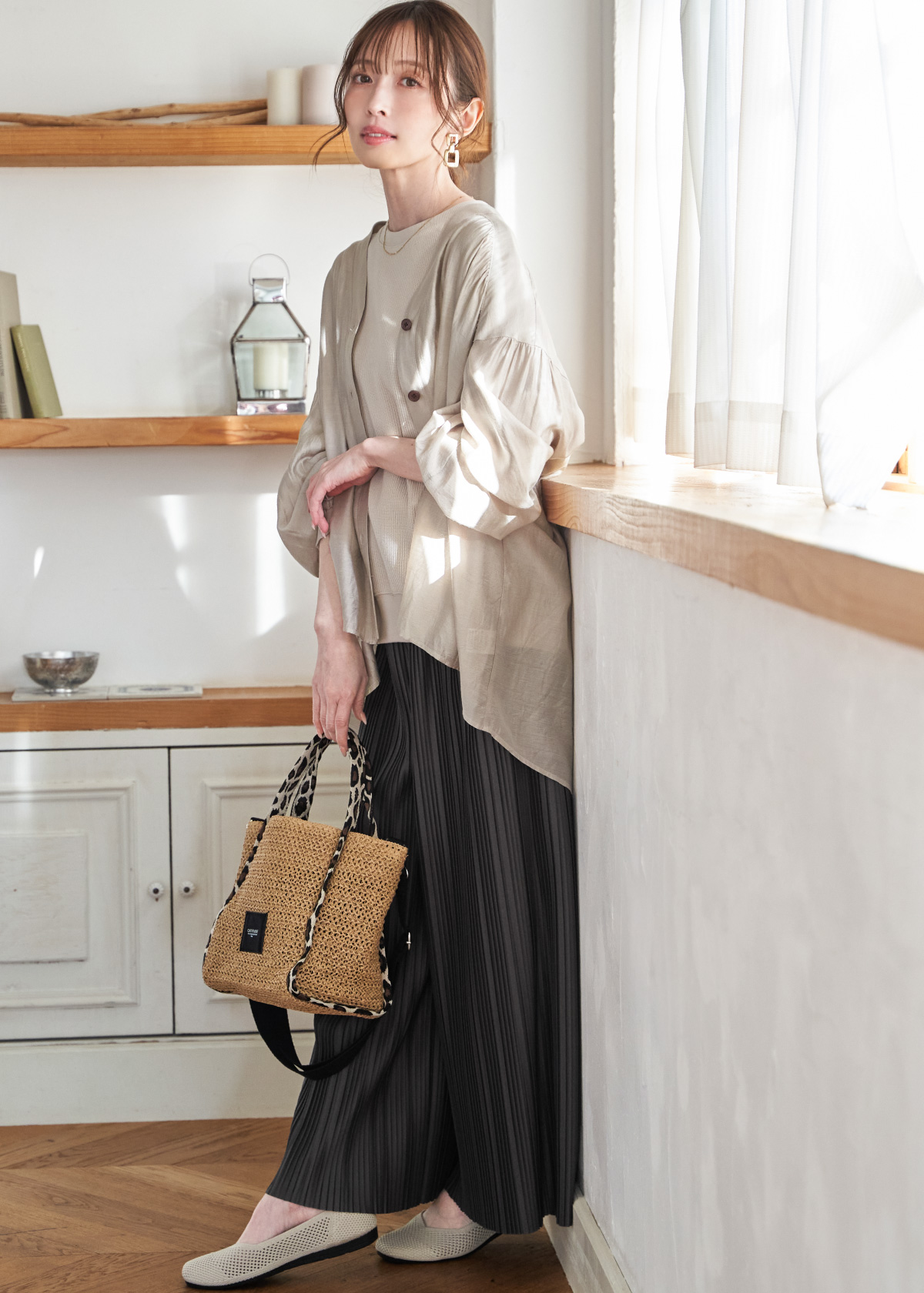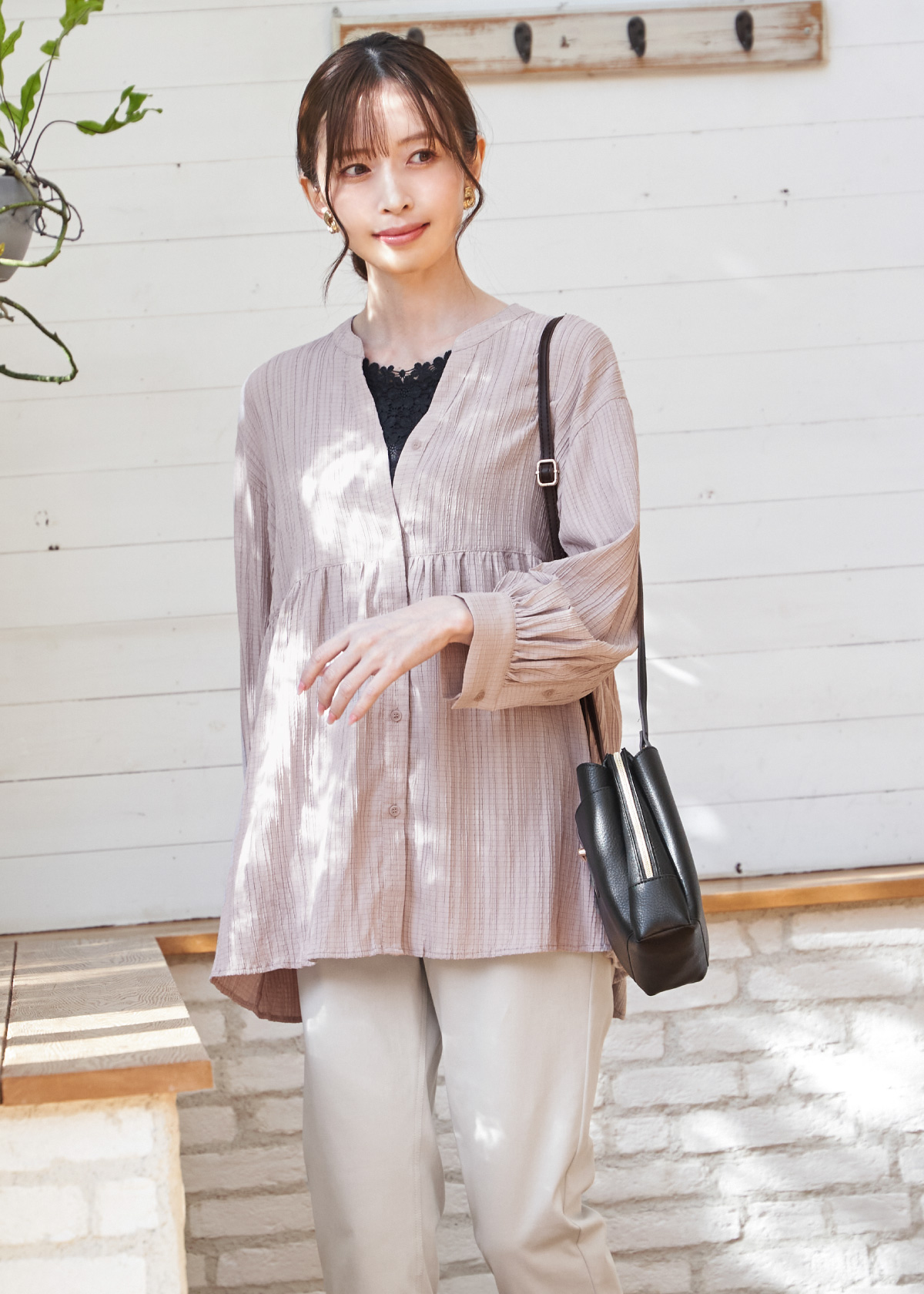 見た目も手触りもさらりと爽やかな楊柳素材のシャツブラウスは動くたびに揺れるドレープが美しく、女性らしさ満点のアイテム。全体的にやわらかなライトカラーでまとめ、インナーや小物は黒で締めることで大人らしくもボヤけないコーデに仕上がります。パンツは伸縮性があり着心地のいい美脚シルエットで日常の頼れる定番アイテムになること間違いなし。