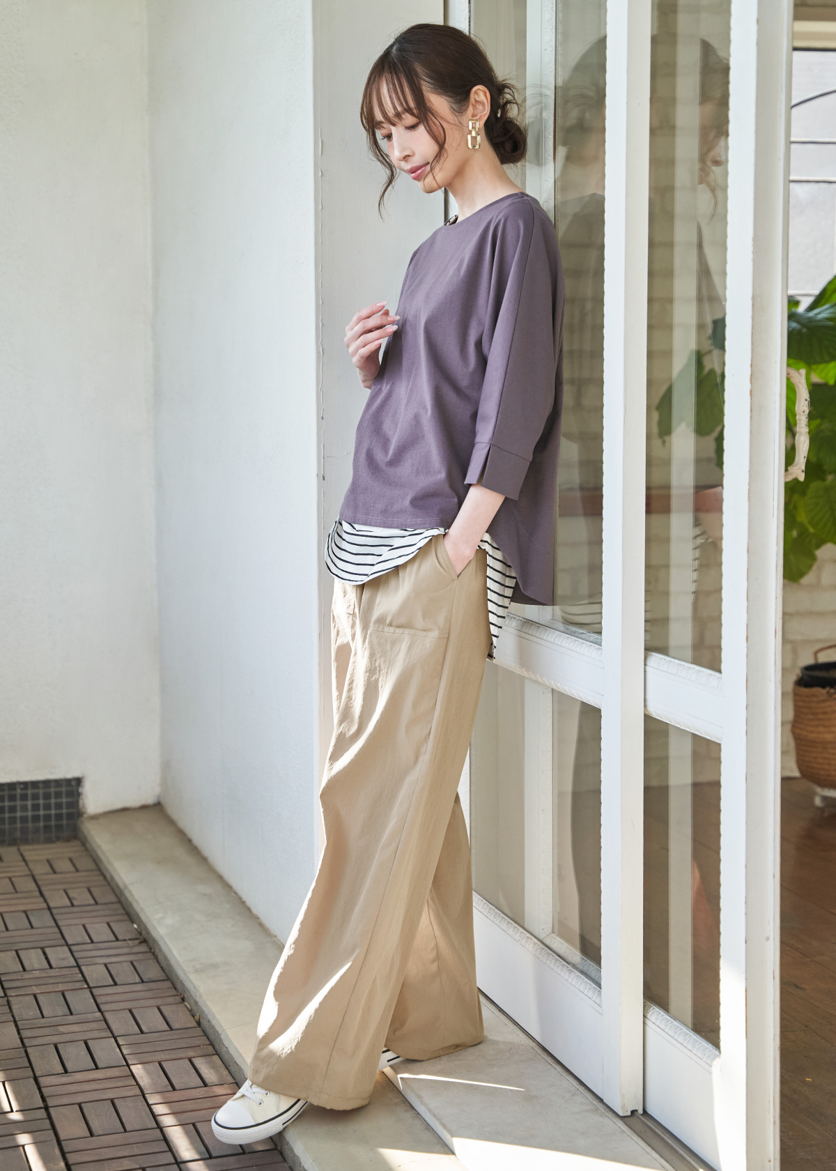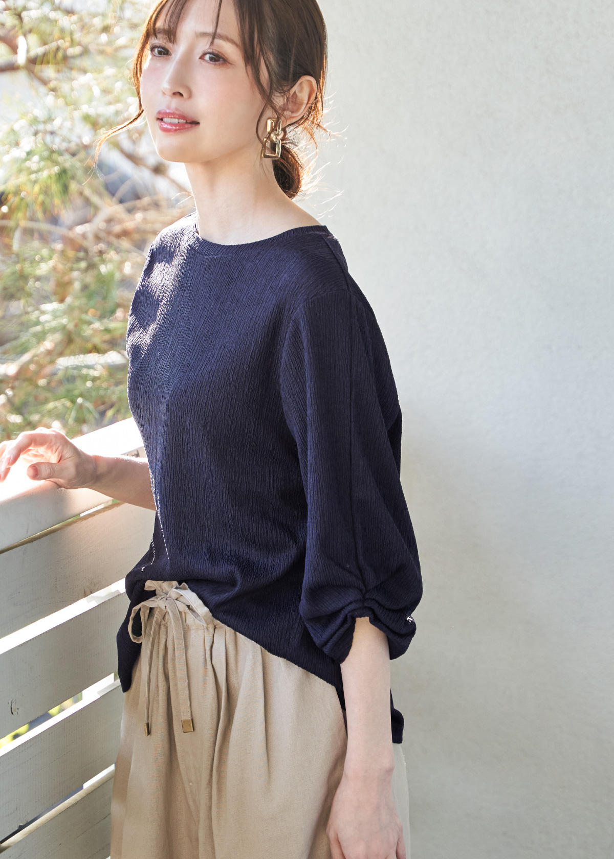 細かな縦柄が入ったような、表面感のあるれたジャガードカットソーのプルオーバー。袖口にタックを寄せたホイップスリーブが、やわらかな立体感をプラスします。春から夏にかけて活躍する麻混のワイドパンツはウエスト部分にシャーリングを寄せており、トップスをインしても華やかな印象になります。