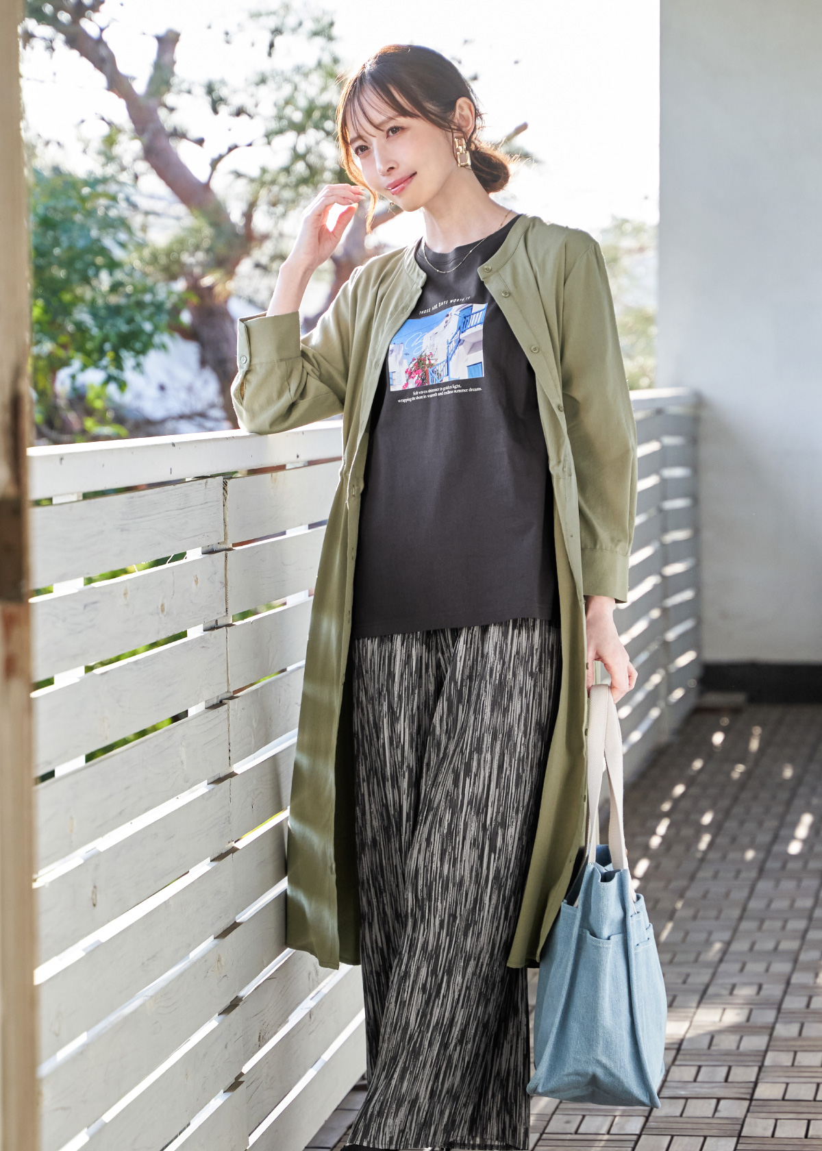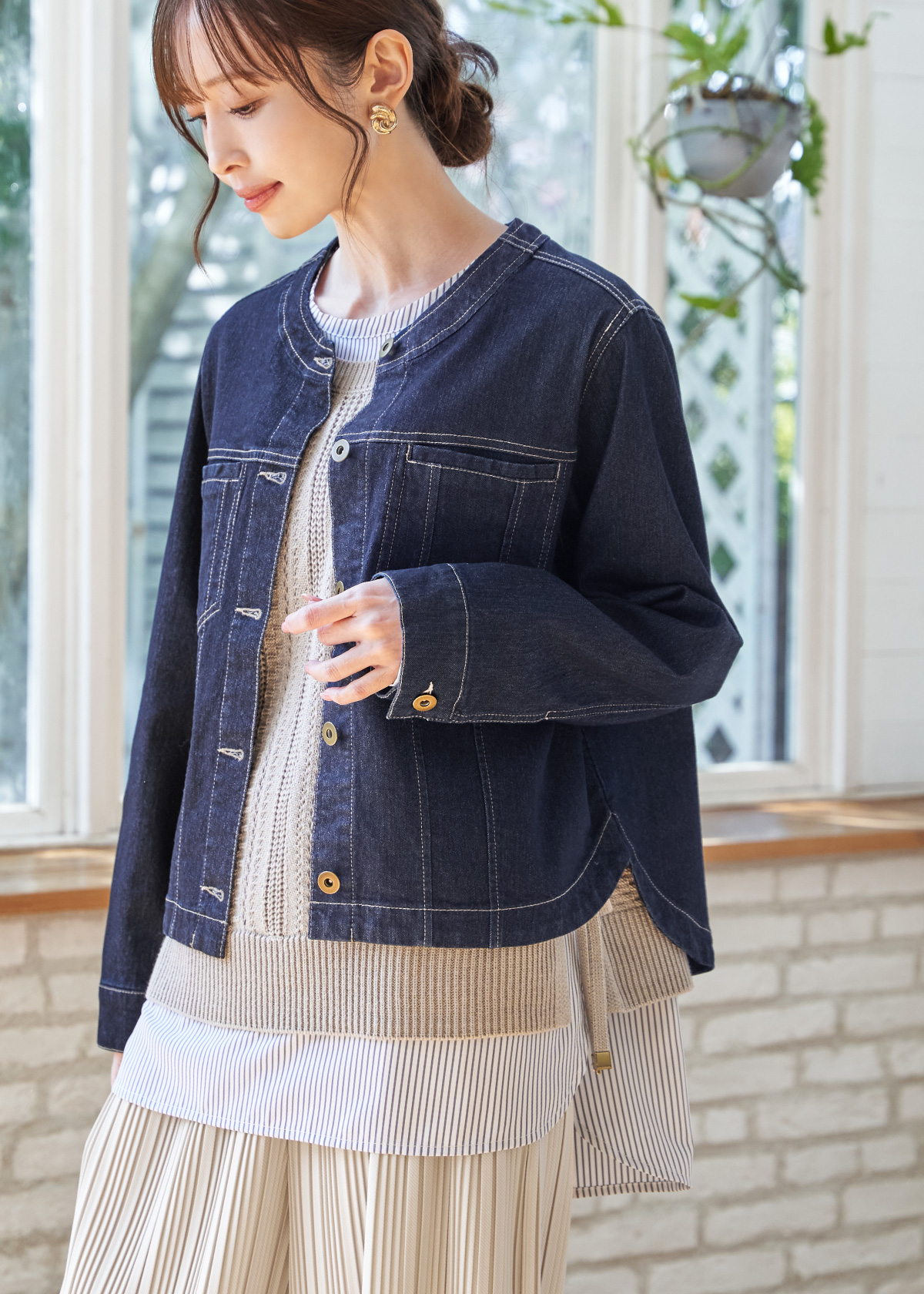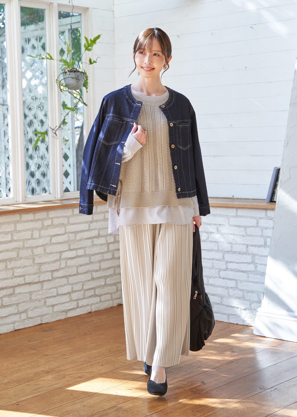 定番Gジャンをベースにノーカラーとシャツテールで軽さのある印象に仕上げたジャケットは、見た目は本格的なデニムながらストレッチが効いた、軽さと動きやすさを備えたアイテム。またニットベストとブラウスは2点セットのお得なアイテムで、忙しい日でもパッとコーデが決まります。足さばきが美しいプリーツワイドパンツを合わせて、春のお出かけコーデの完成です。