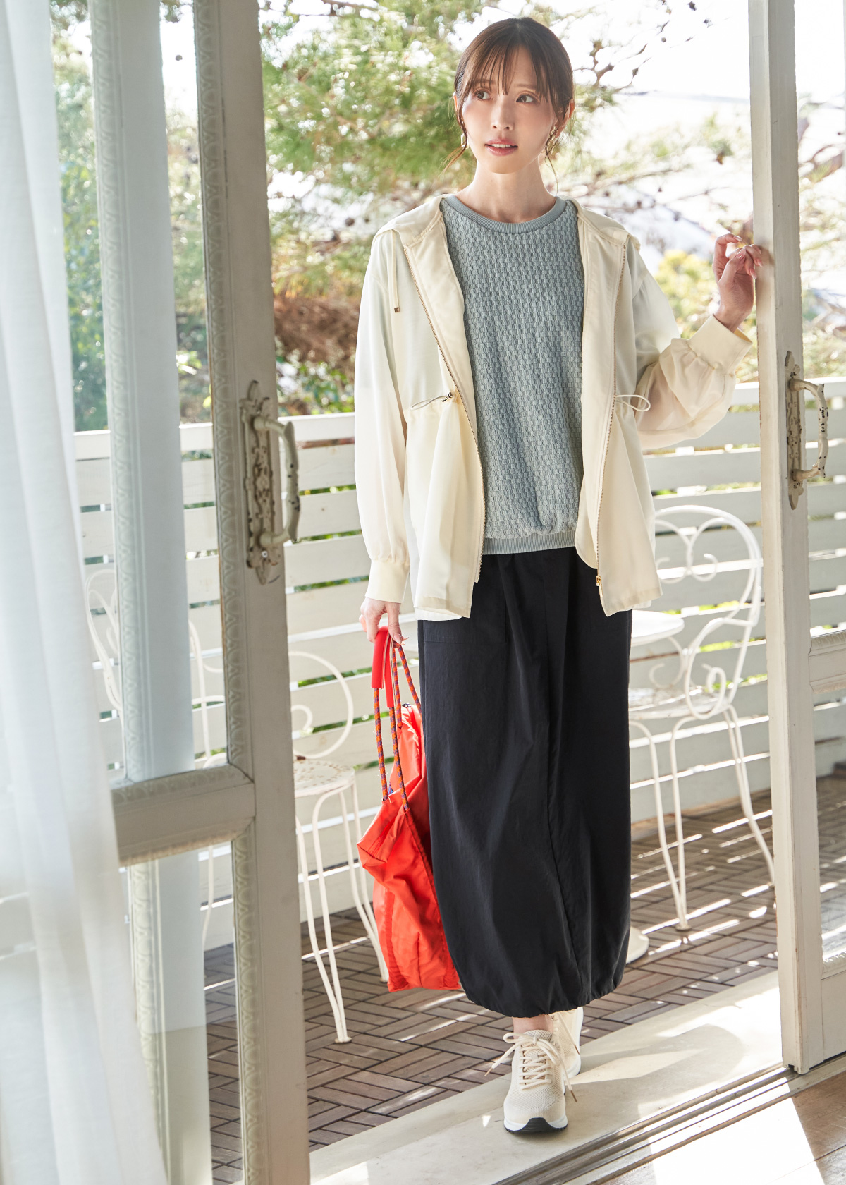春の日差しの下でも映えるシアー素材のマウンテンパーカー。ウエストはドロストでシルエット調整が可能で、軽やかな印象だからコーデを選ばず着やすいのが嬉しいポイント。昨年から引き続き人気上昇中のドライテックチノベイカースカートは裾のドロストを調整することで、すっきりとしたAラインから丸みのあるバルーンシルエットまでアレンジが可能で、カジュアルな素材ながら女性らしい着こなしが楽しめます。
