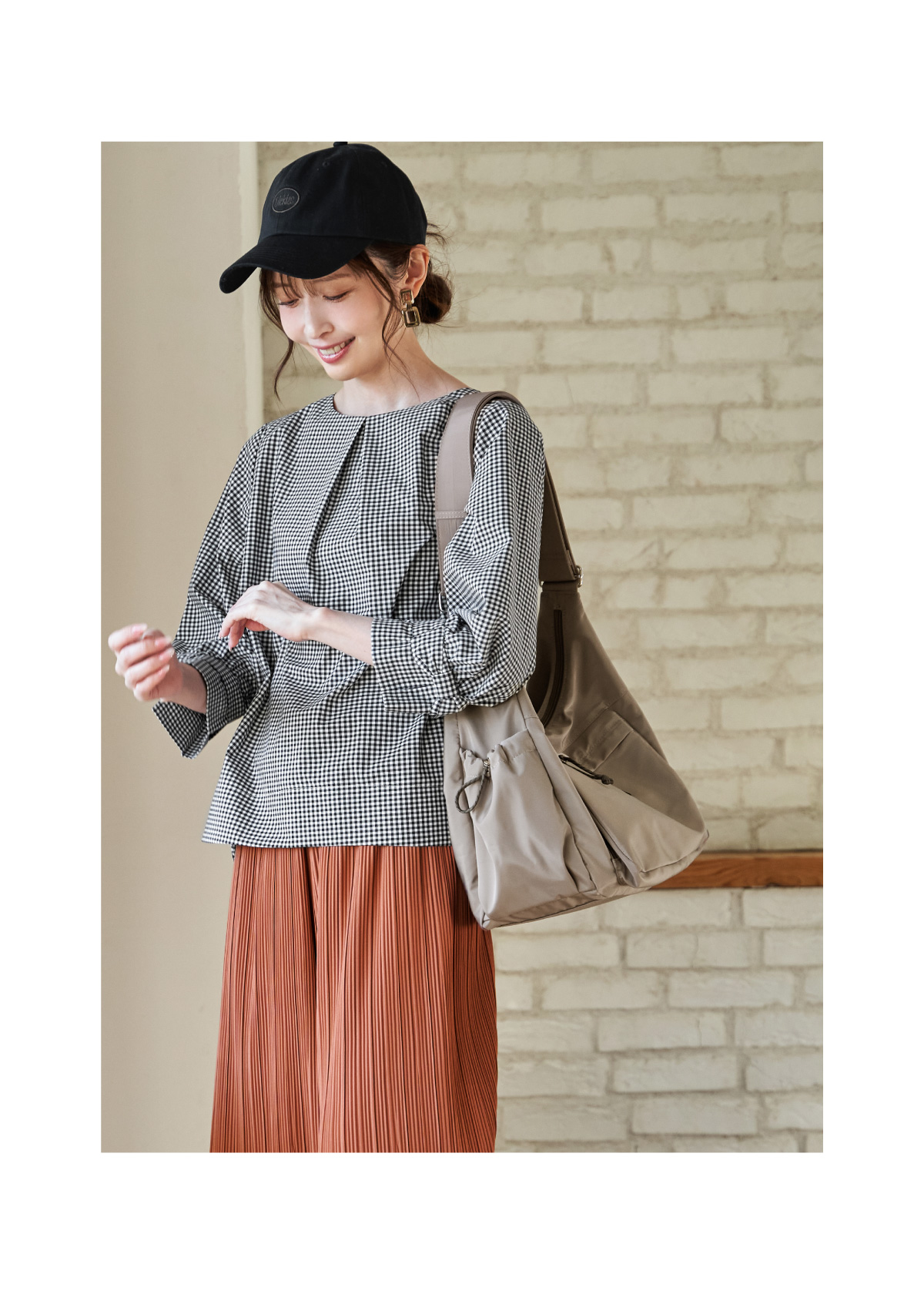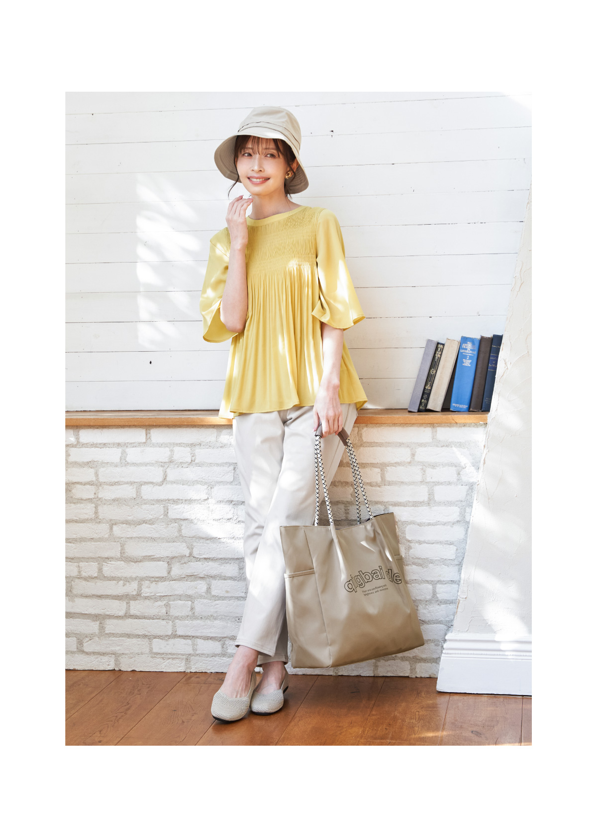 繊細なマジョリカプリーツを施した、表情豊かなデザインブラウス。裾に向かって広がるAラインシルエットが軽やかな動きを生み、着るだけで印象的なスタイルが完成します。二の腕をカバーするやや広がりのある袖は、ひじ下までの安心丈。ロゴ入りビッグトートは撥水加工でちょっとしたアウトドアや旅行にも最適。
