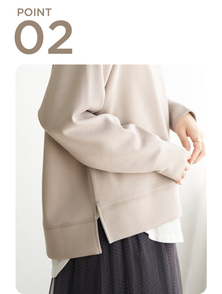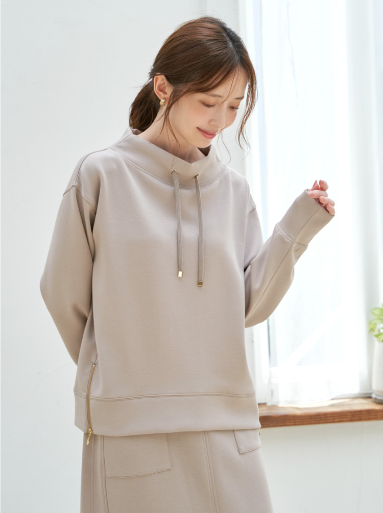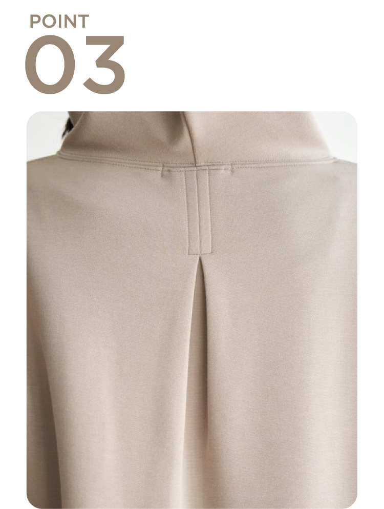 首元にきれいに沿ったモックネックはカジュアル過ぎず大人な雰囲気の抜け感を演出。