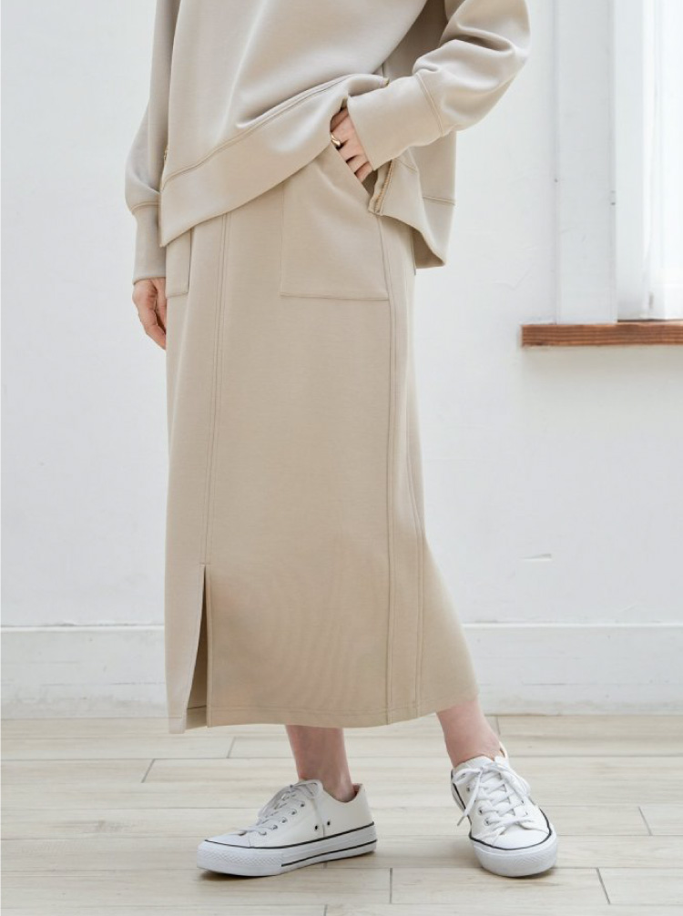 なめらかな肌ざわりとほどよいハリ感が魅力のダンボールニット素材を使用したタイトスカート。身体のラインを拾いすぎず、すっきりとしたシルエットが魅力。きれいめからデイリーまで、幅広い着こなしにフィットします。