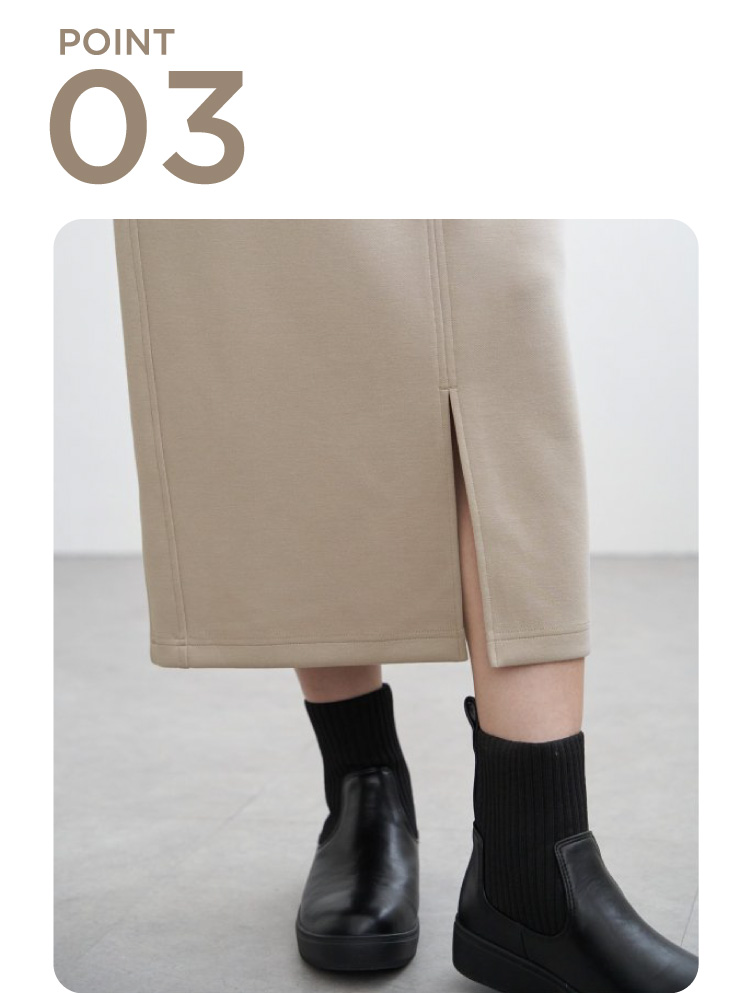 裾スリットは金属ファスナーで開閉可能なので、スタイルに合わせて楽しめます。