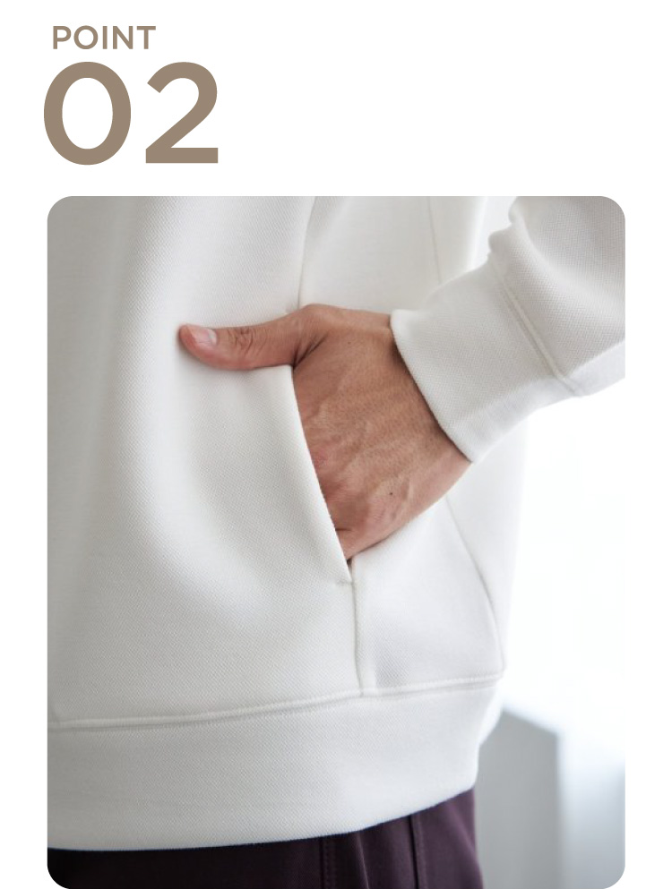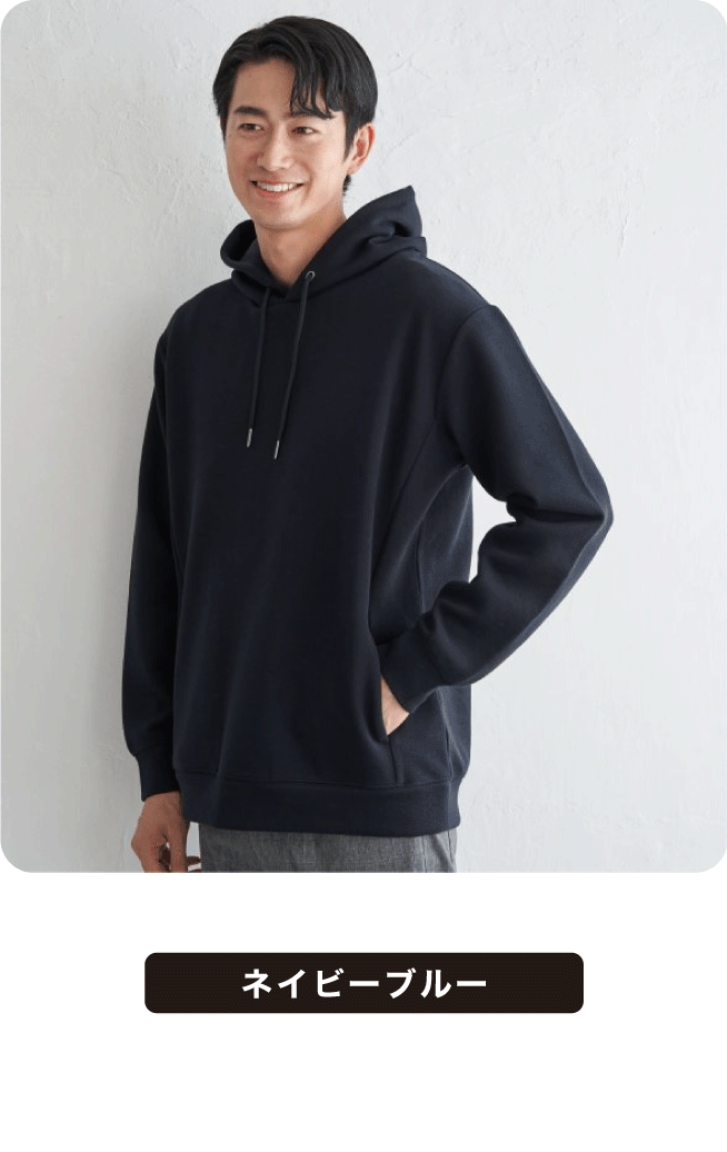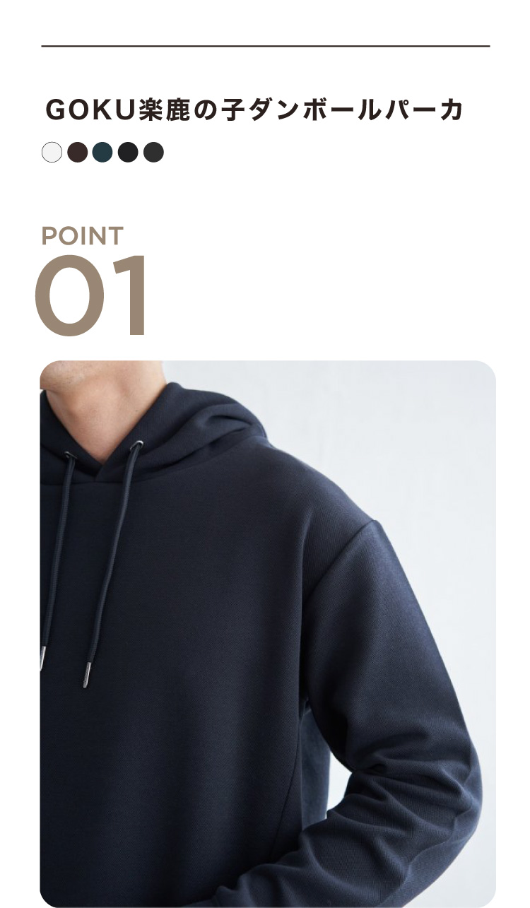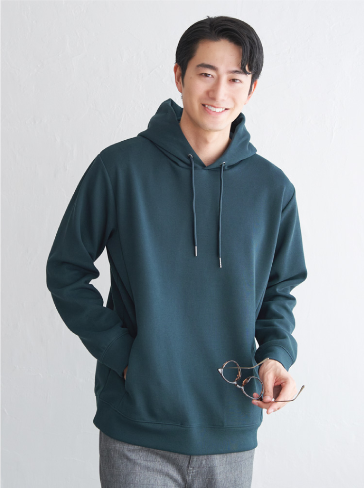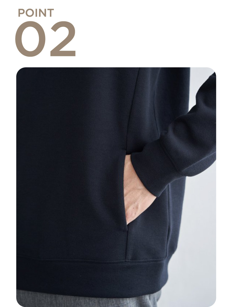 もちっとしたやわらかさが魅力のダンボール素材を使用したパーカ。ストレッチ性、抗菌防臭加工を兼ね備え、機能性にもこだわりました。フードの立ち上がりも美しく、ラフすぎない見た目です。