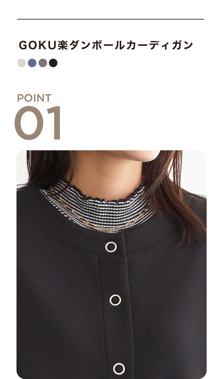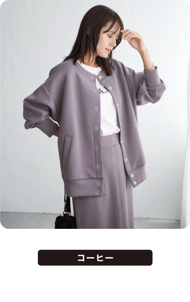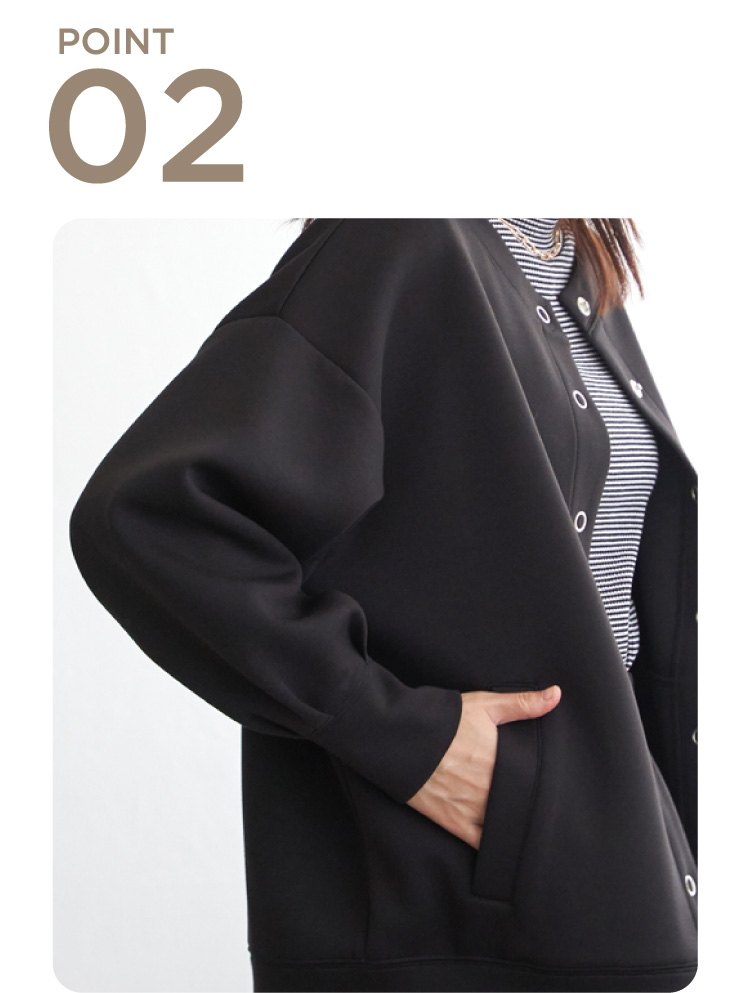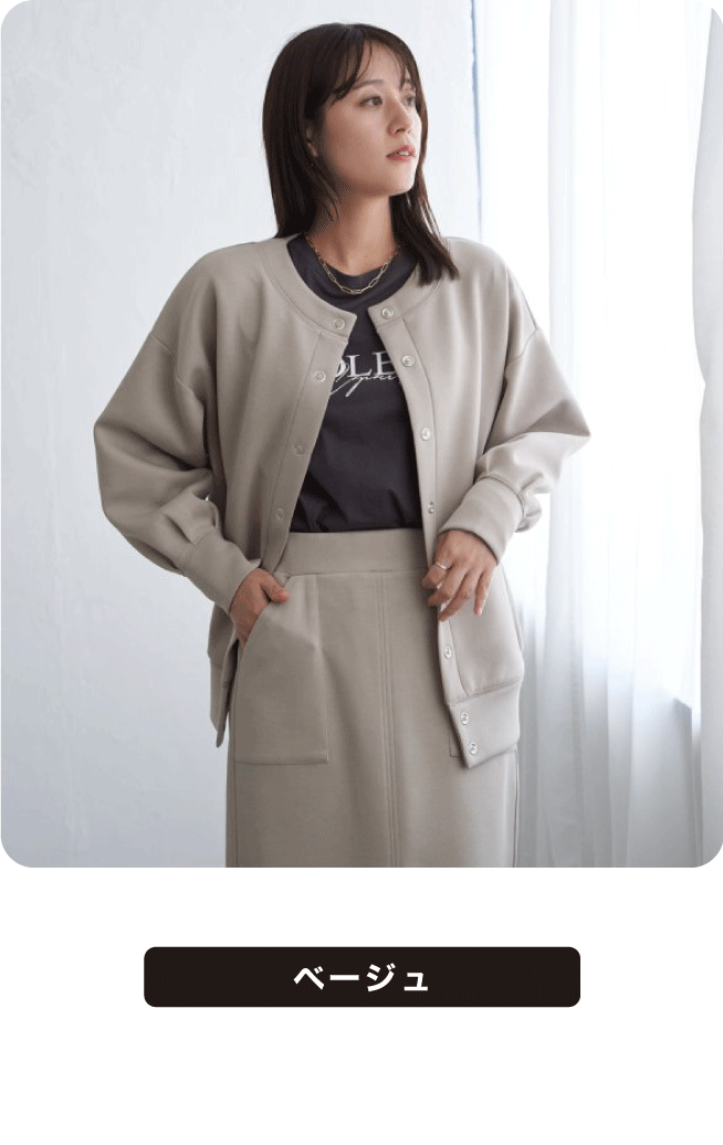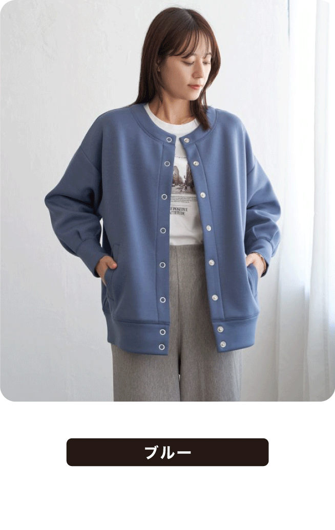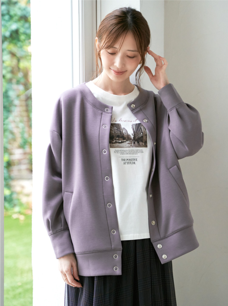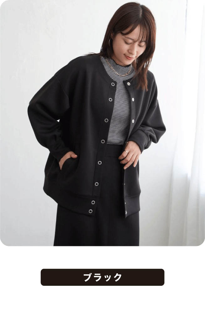 ノーカラーのすっきりとしたネックラインに、大ぶりのリングドットボタンがアクセントを添えます。