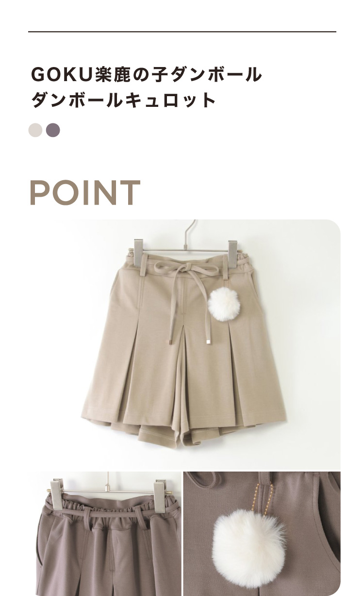 スカートのように見えて、実は動きやすいキュロットタイプ。取り外し可能なポンポンチャームがアクセントになり、通学にもおでかけにもぴったりの一着。
