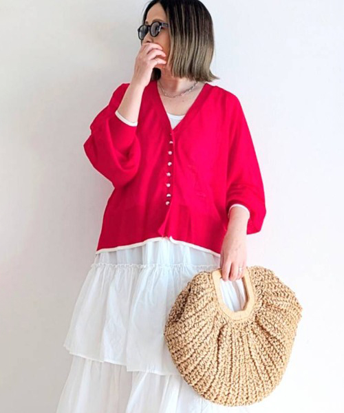 使いやすいVネックデザインと女性らしいルーズなシルエットでさっと羽織るだけでも◎