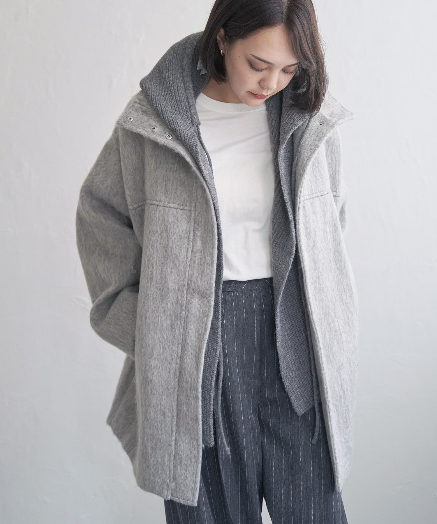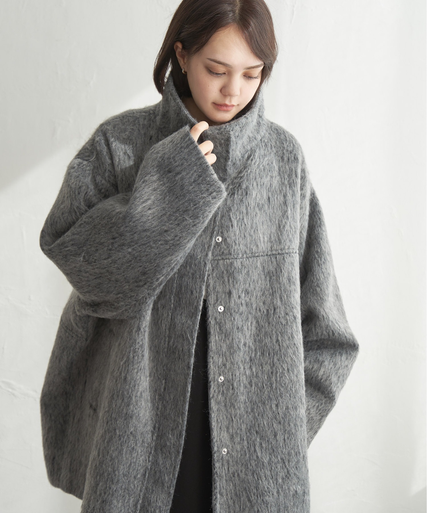 スタンドカラーとコクーンシルエットがポイントの【 notch. by yui 】シャギースタンドカラーコートが