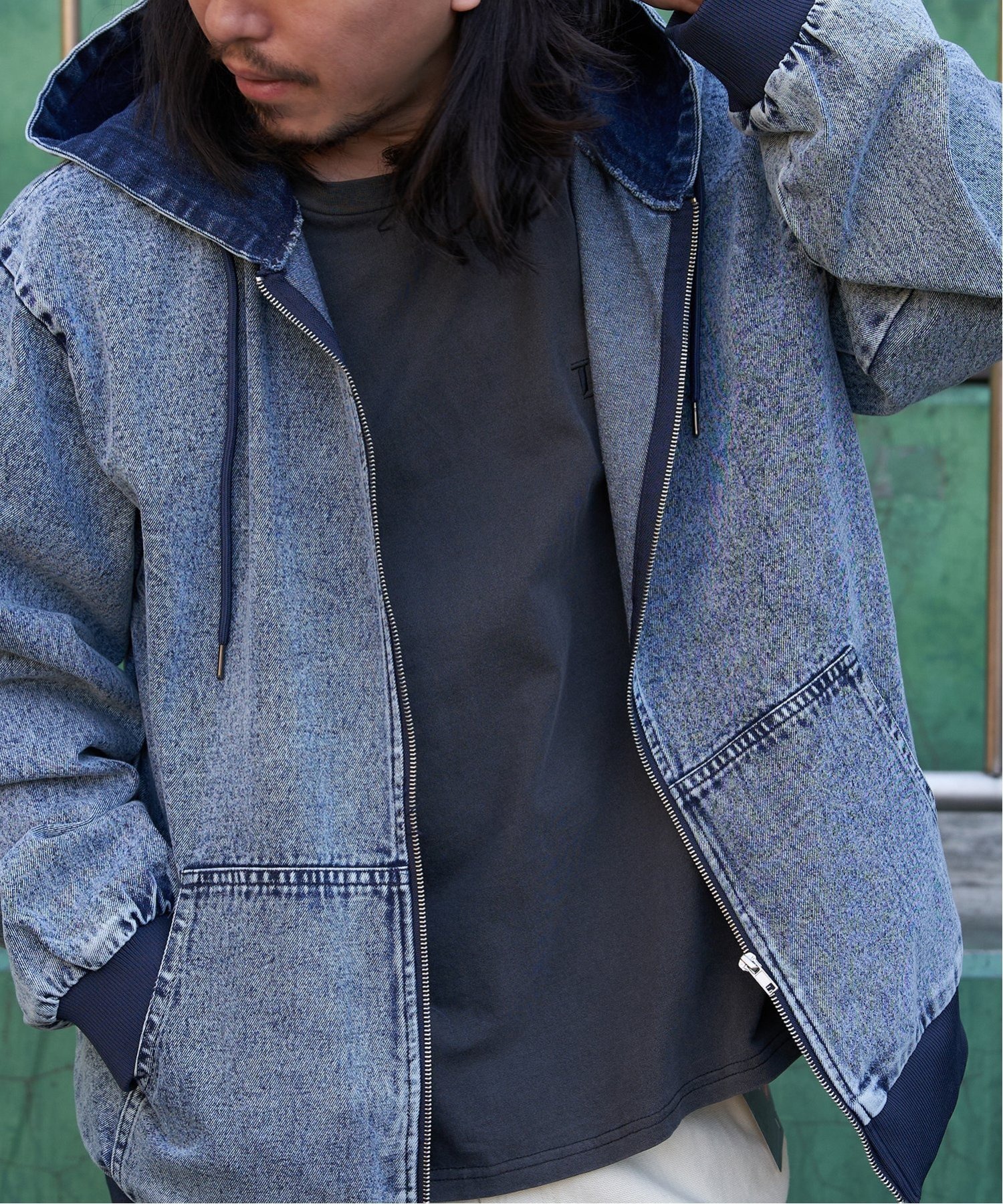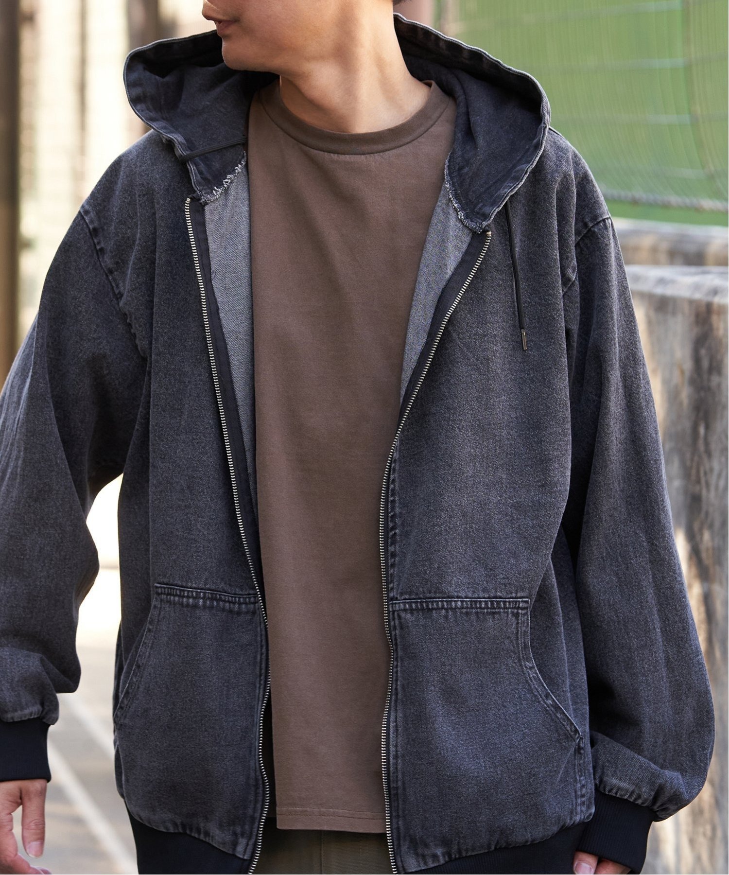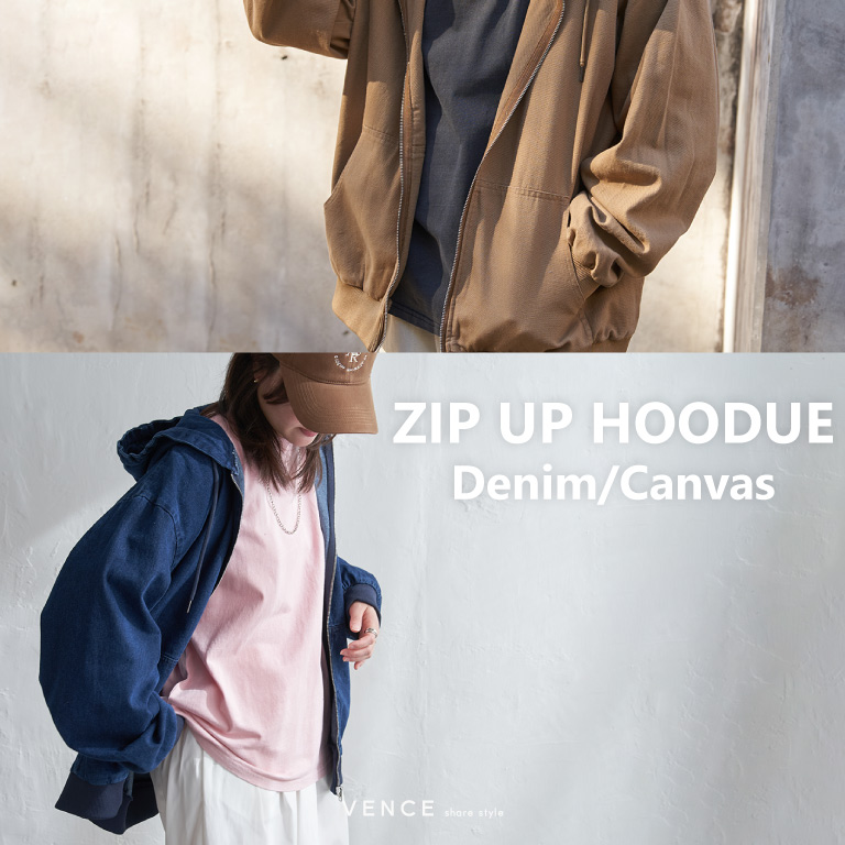 無駄をそぎ落としたシンプルなデザインに、デニムとキャンバスの素材感が映えるフルジップパーカー。
