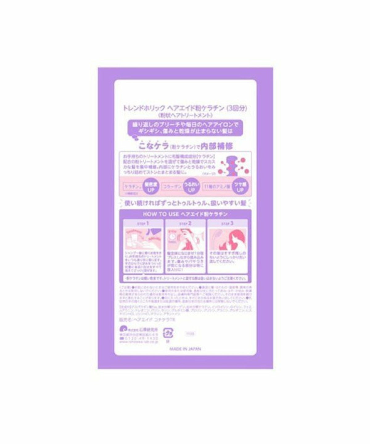 ROU 他の画像を見る 在庫切れ トリートメントに混ぜるだけ ! 粉ケラチンで内部補修 トレンドホリック ヘアエイド粉ケラチン 3回分(2g×3包)【石澤研究所】 ¥ 1,210 税込 カートに入れる お気に入りに登録する