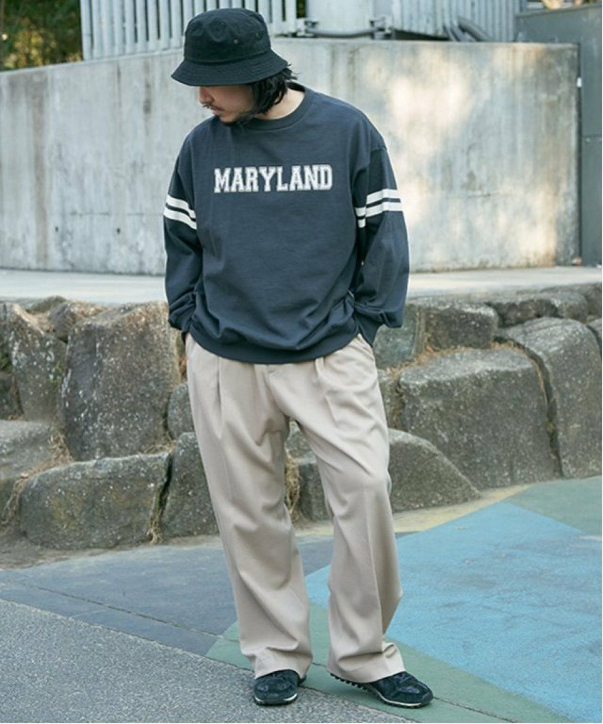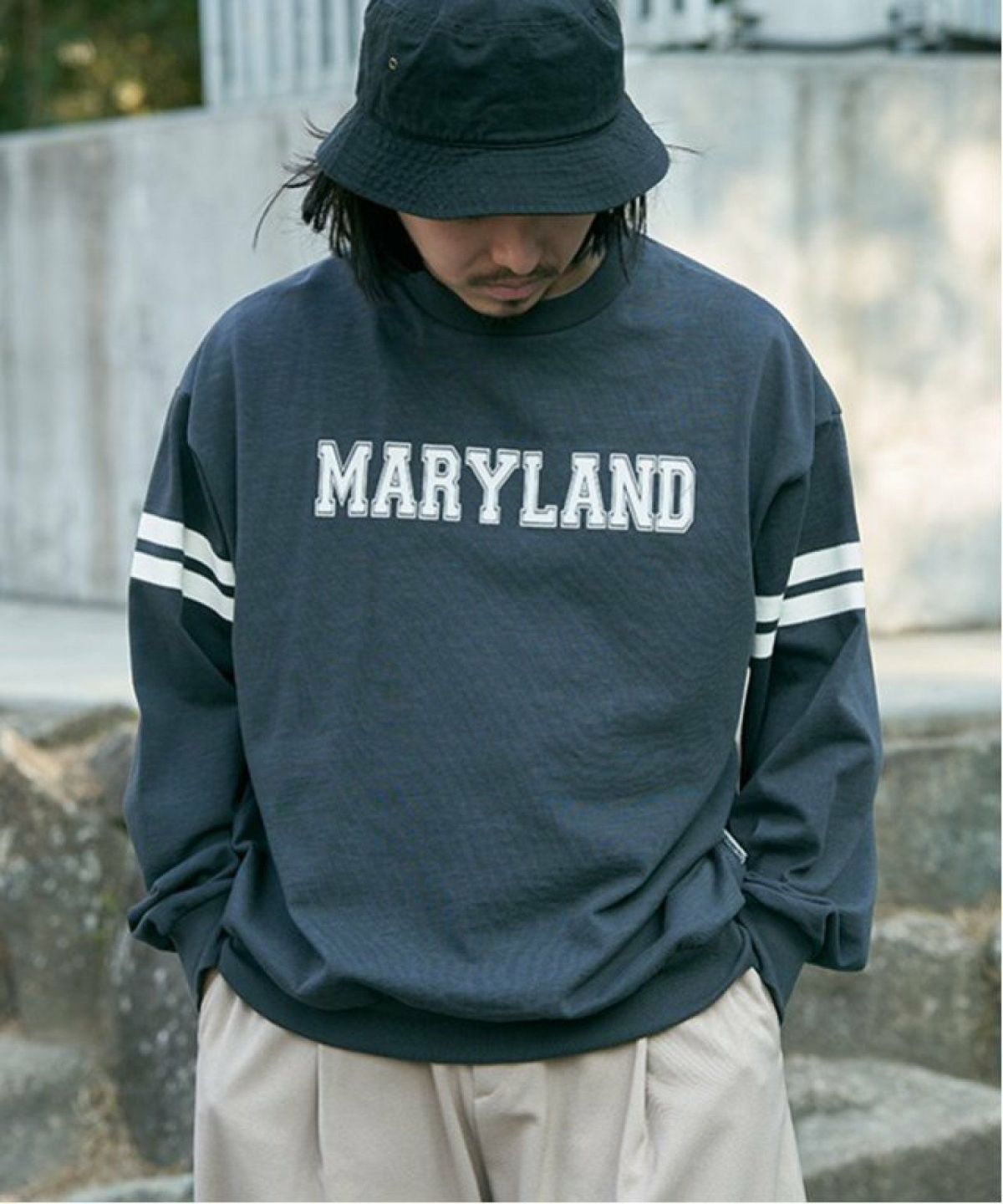 軽量で丈夫なナイロン素材のバケットハット UNIVERSAL OVERALL ユニバーサルオーバーオール タイプライターバケットハット