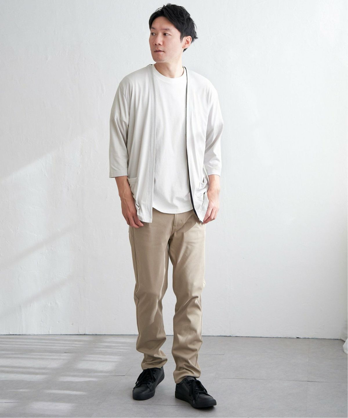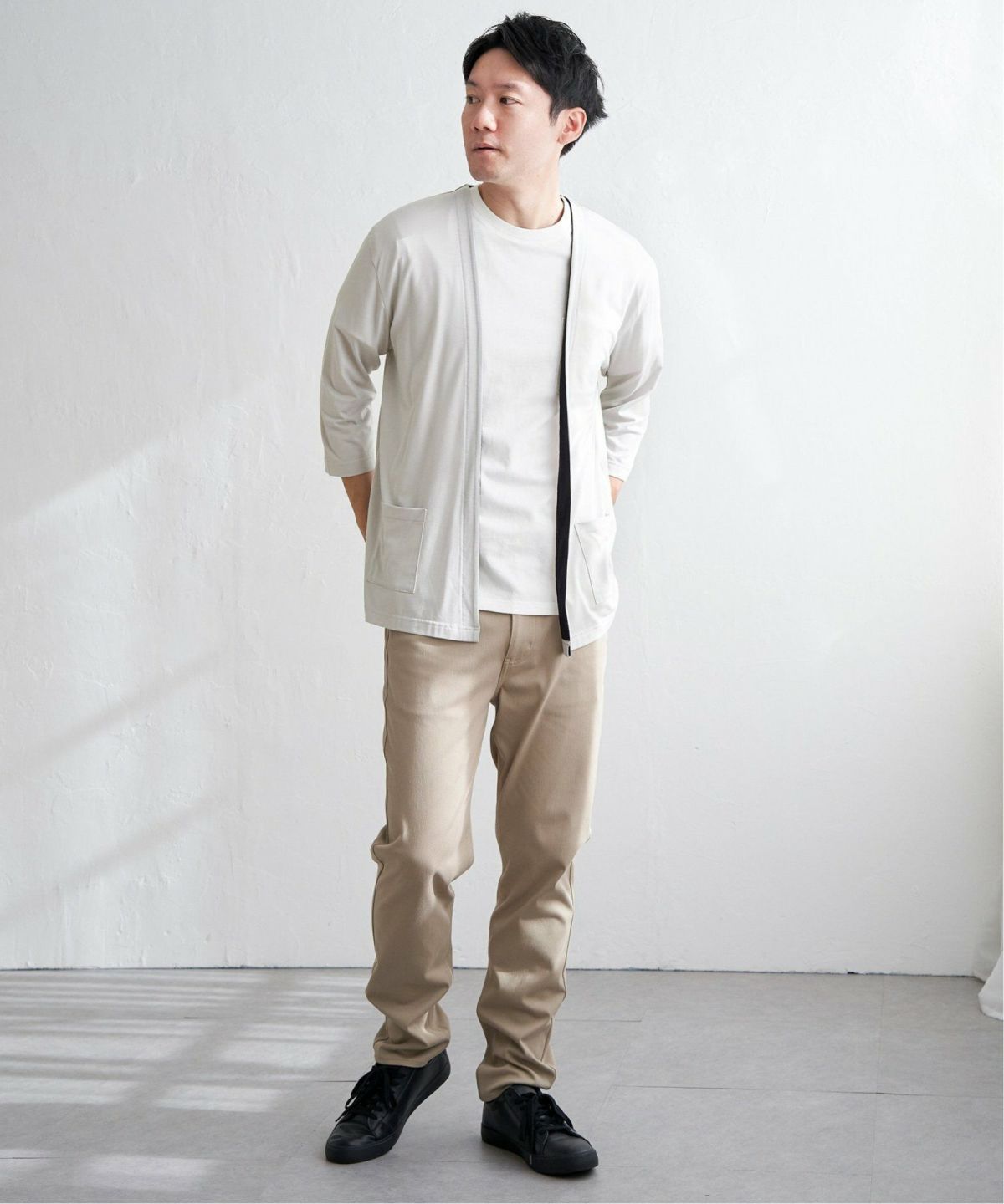 シンプルな中に映える、さりげない配色 7分袖バイカラーボタンレスカーディガン