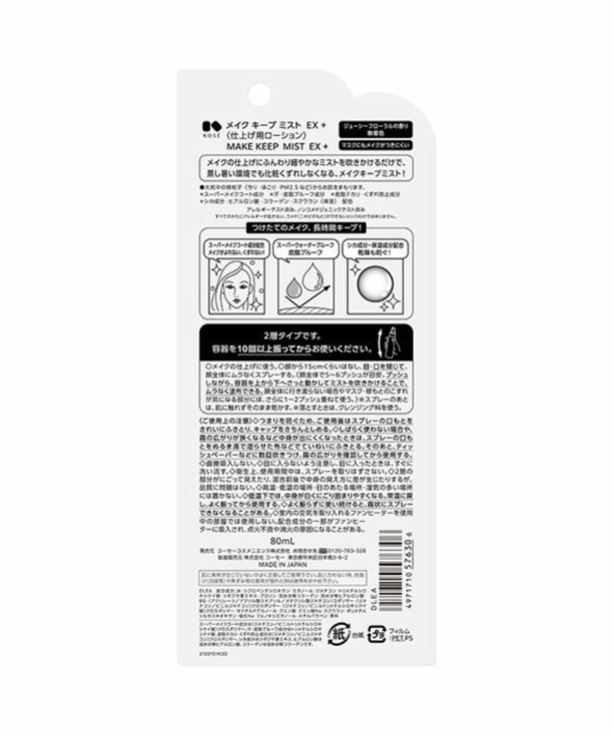 ROU 他の画像を見る メイクの仕上げにひと吹き、化粧くずれを防ぐミストがパワーアップ ! コーセーコスメニエンス メイクキープ ミスト EX+ 80mL ¥ 1,430 税込 カートに入れる お気に入りに登録する