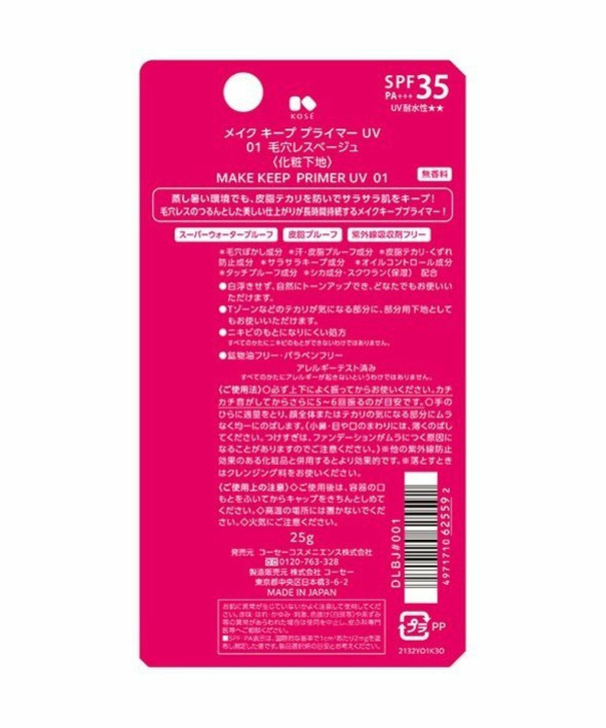 ROU 他の画像を見る 毛穴レスのつるんとした美しい仕上がりが長時間持続。 コーセーコスメニエンス メイクキープ プライマー UV SPF35・PA+++ 01 毛穴レスベージュ 25g ¥ 1,430 税込 カートに入れる お気に入りに登録する