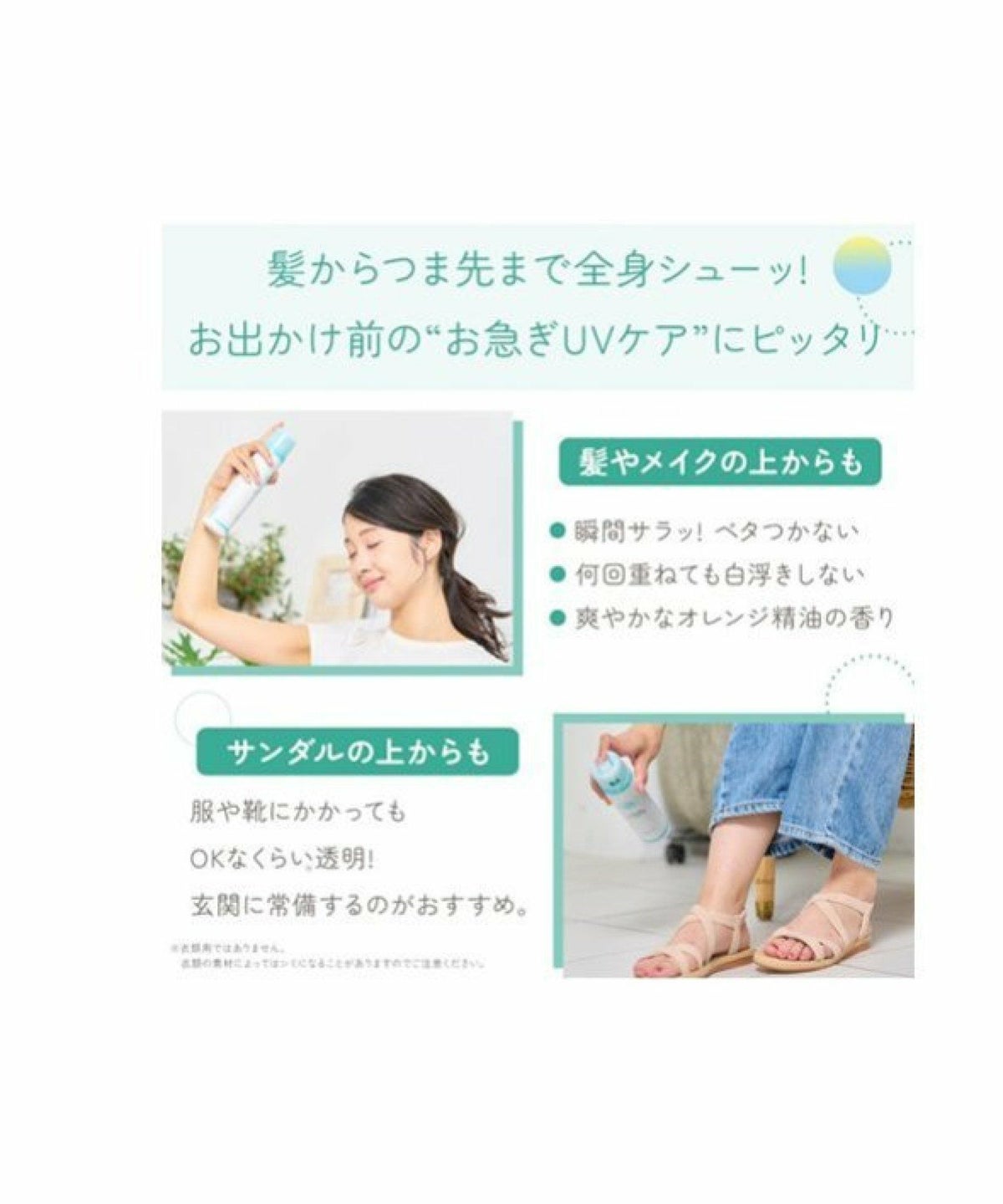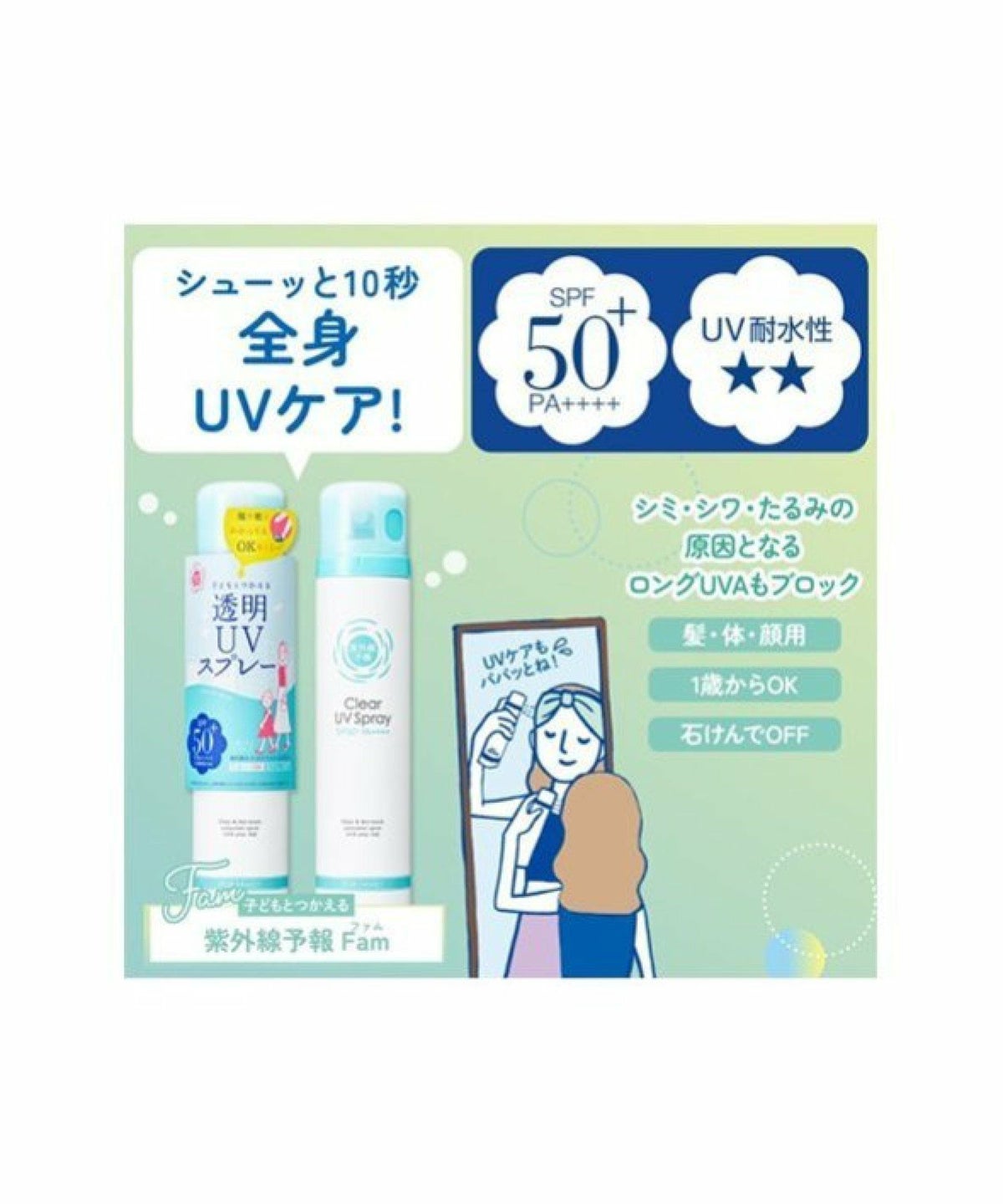 ROU 他の画像を見る 全身シューッ ! 瞬間サラッと気持ちいい 透明UVスプレー 紫外線予報 透明UVスプレー F SPF50+ PA++++ 150g【石澤研究所】 ¥ 2,255 税込 カートに入れる お気に入りに登録する