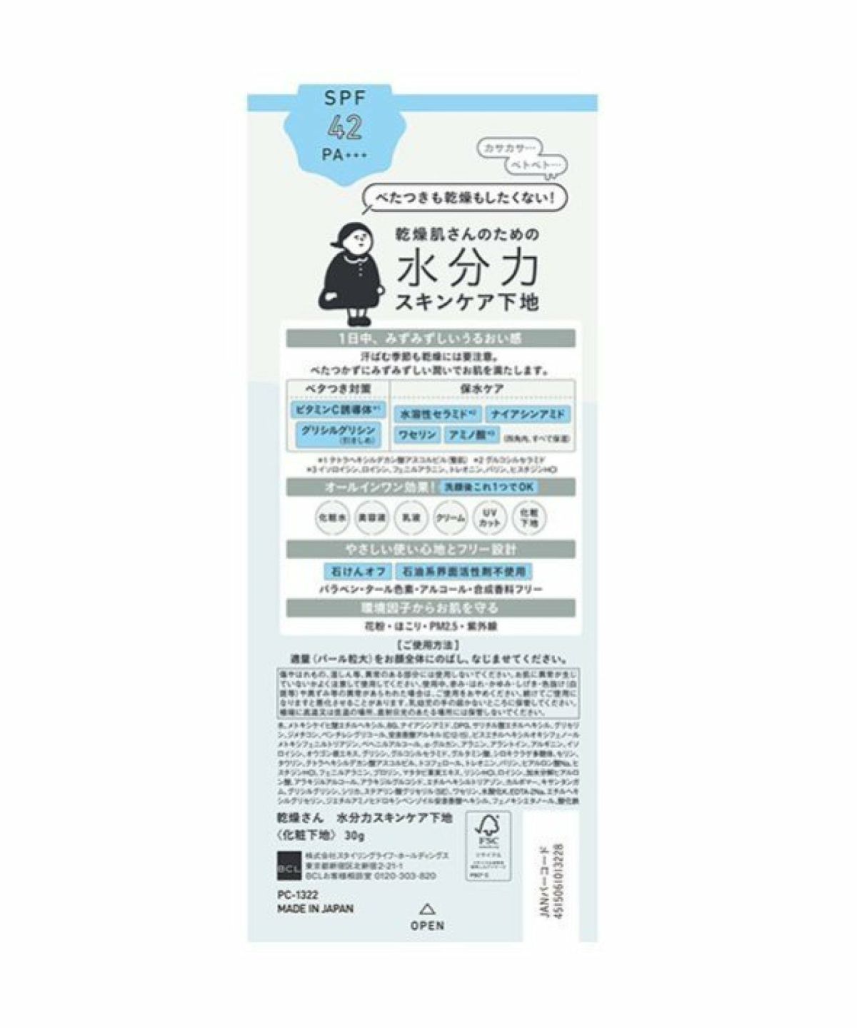 ROU 他の画像を見る スキンケア下地、カサつきを抑えてしっとりふっくらとした肌をキープ 乾燥さん KANSOSAN 水分力スキンケア下地 30g【BCLカンパニー】 ¥ 1,430 税込 カートに入れる お気に入りに登録する