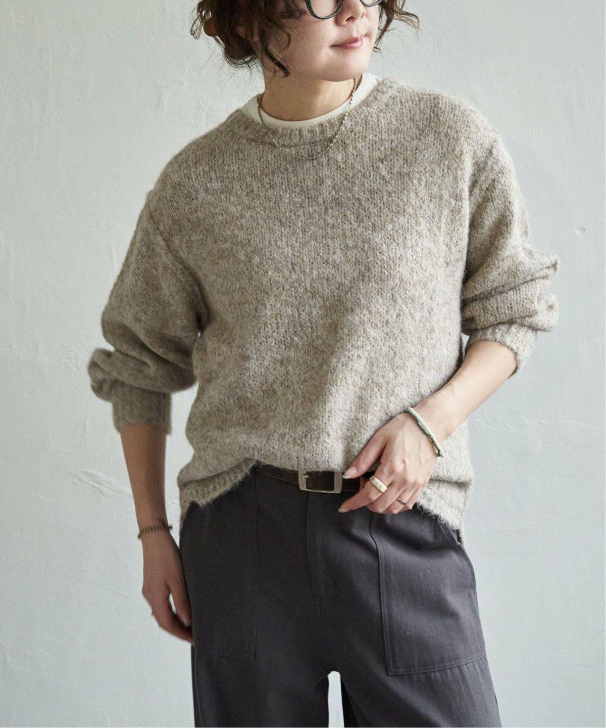 編地変化によるブロッキングのこだわりアイテム ブロックスクルーネックニット