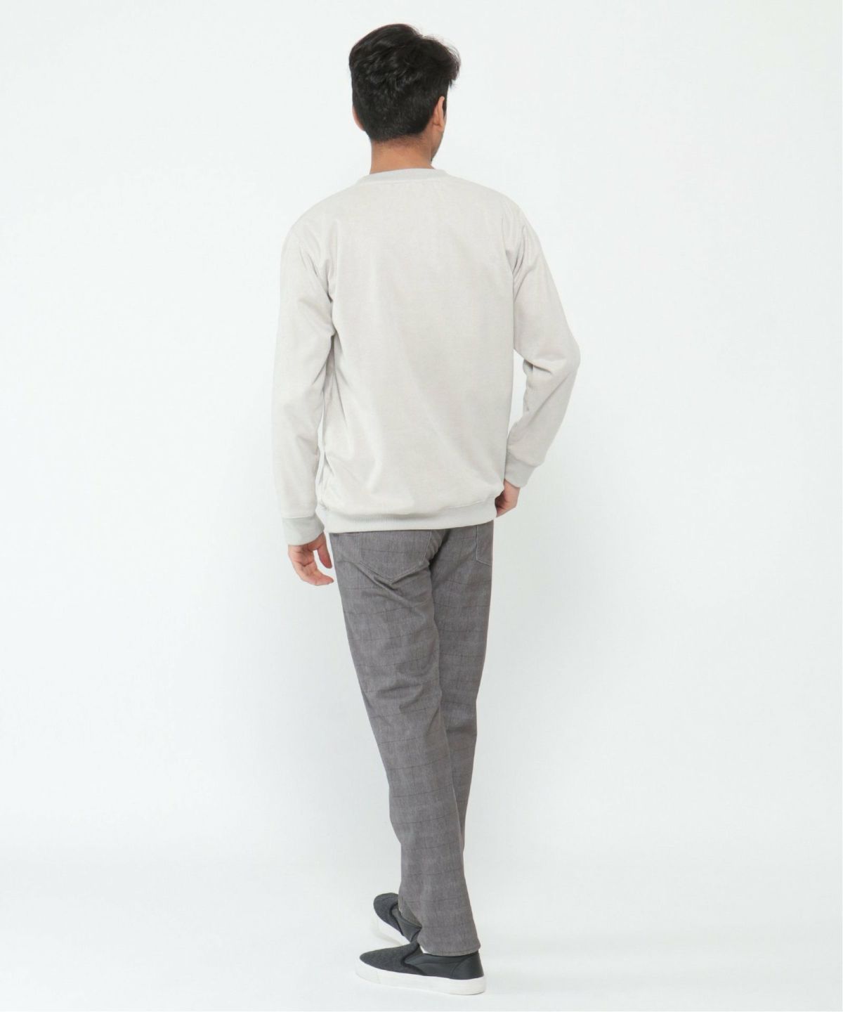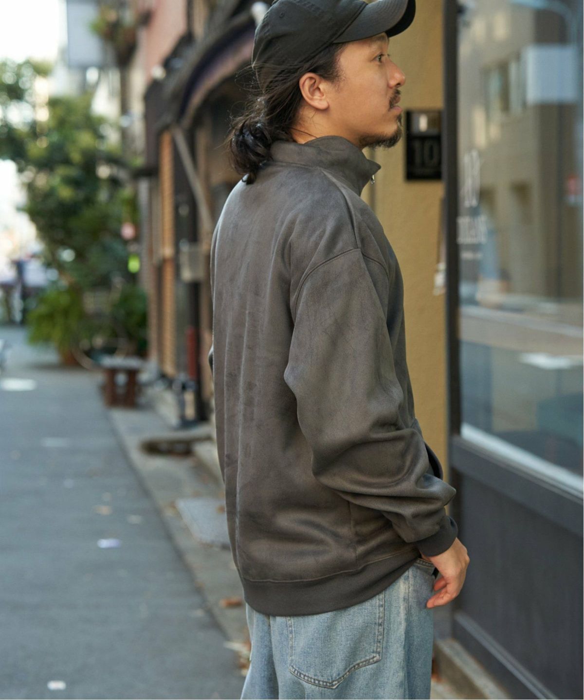 ユニセックスに着られる!シンプルトレーナー フェイクスウェードヒゲ刺繍ハーフZIP