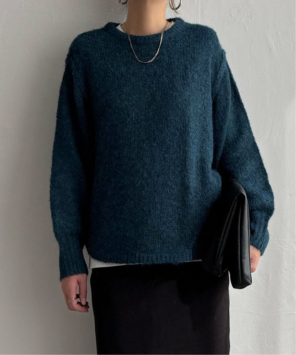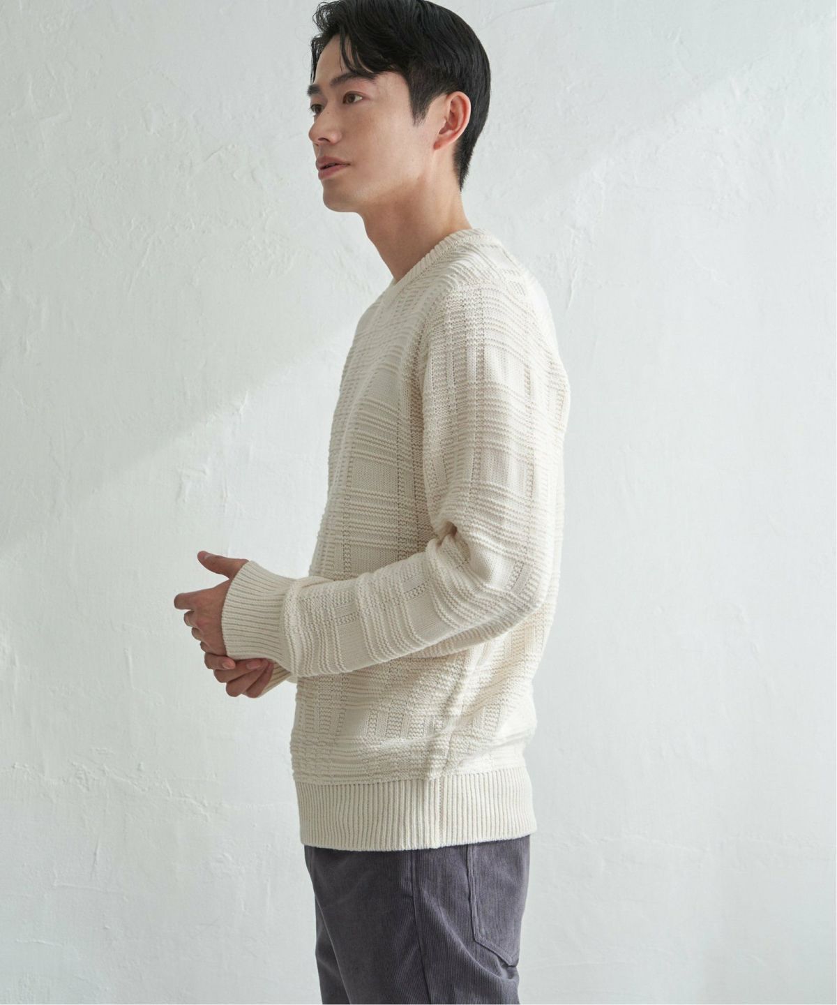 編地変化によるブロッキングのこだわりアイテム ブロックスクルーネックニット